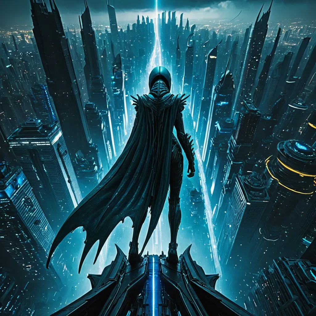 A vertical , dark teal-blue image showing a solitary Xenomorph Queen , cloaked and viewed from behind , standing on a narrow , dark perch overlooking a sprawling , dense city. The figure looks up at a massive , a woman in a yellow outfit and black boots , humanoid creature that is dissolving into countless thin , trailing , vertical filaments that plunge towards the cityscape below. The creature is brightly backlit by a top-down , cool-blue light source and sleek , aerodynamic vehicles speeding through the air , highlighting its decaying form against the dark , cloudy sky. Below , the city is a dense grid of skyscrapers glowing with intricate , cool-blue lights. The overall atmosphere is dark , cool-toned , and ominous. ,