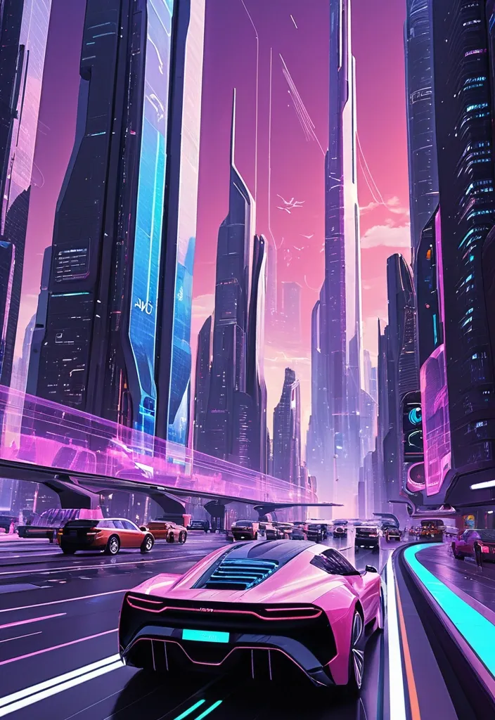 Style: Concept Art. Scene: A futuristic cityscape , with towering skyscrapers and sleek , aerodynamic vehicles speeding through the air. The high-resolution OLED GUI interface displays in the windows of the buildings are filled with transparent data visualization infographics , displaying everything from weather patterns to traffic flow. The colors are saturated and vibrant , with warm pinks and purples dominating the skyline. The overall effect is both beautiful and awe-inspiring. ,