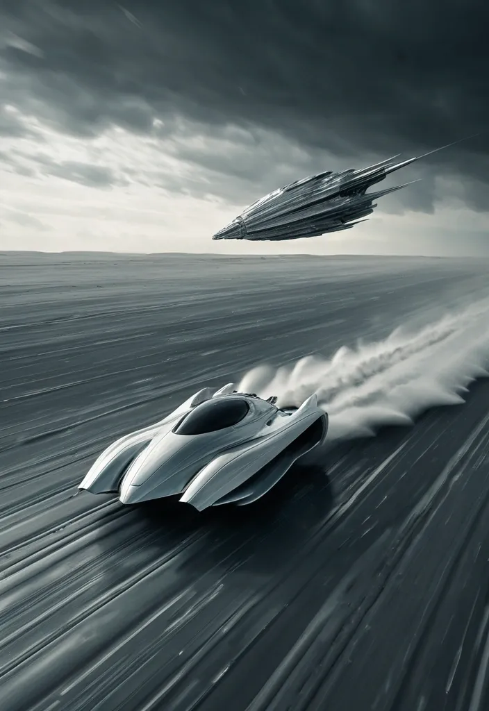 Mysterious machinery and a flying vehicle dominate the space scene , captured in motion blur with a long-range shot. The craft , made of sleek sliver metallic , liquid-like surface , features a long , wave-like seashell edge. It moves at high speed through a surreal , cloudy , and dramatically vast expanse , devoid of human presence , except for an Indian mature man sitting within. The photo showcases dynamic sweeping lines under natural lighting , taken with a shutter speed of 1/15s. ,