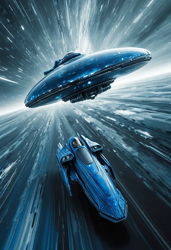 Science fiction machinery and a giant flying vehicle dominate the space scene , captured in motion blur with a long-range shot. The craft , made of sleek blue metallic , liquid-like surface , features a long , wave-like jellyfish with glass cockpit. It moves at high speed through a surreal , cloudy , and dramatically vast expanse , devoid of human presence , except for an Indian mature man (Use the uploaded image as the sole and 100% exact face) , in space costume sitting within. The photo showcases dynamic sweeping lines under natural lighting , taken with a shutter speed of 1/15s. ,