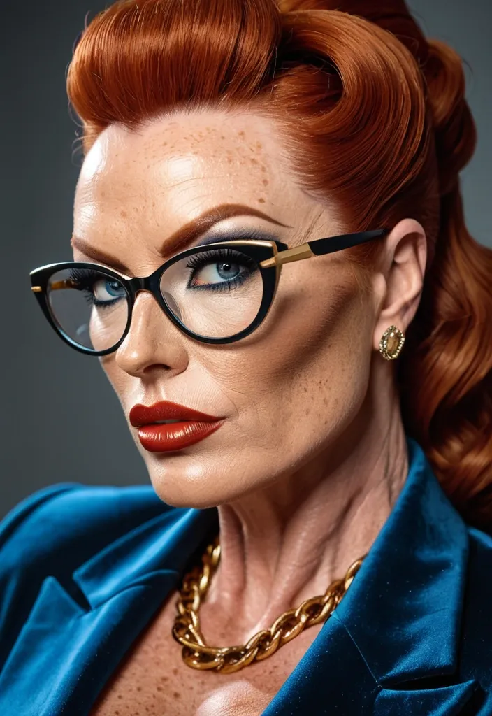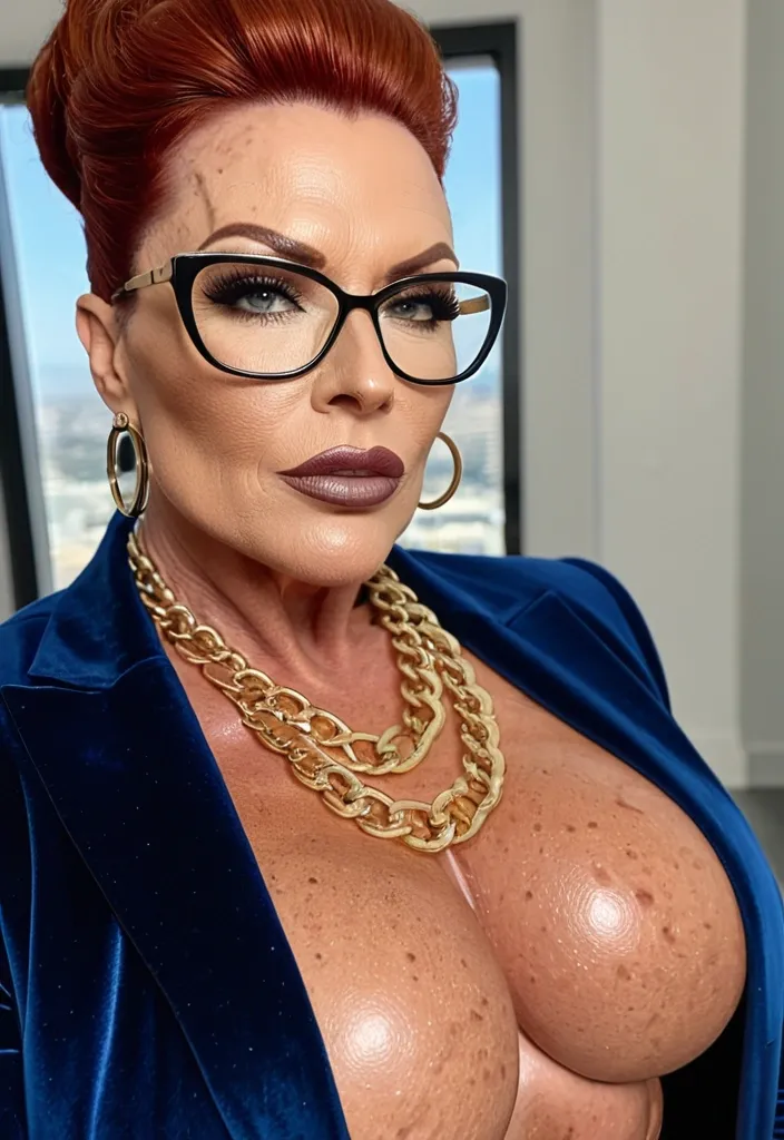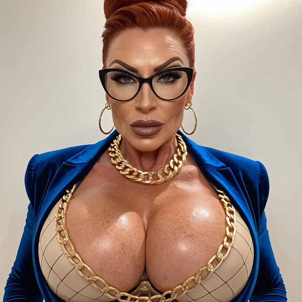Generate a Gorgeous 42 year old female boss , bimbo , hourglass body , eyeglasses abnormally massive female bodybuilder , gorgeous , close up , full lips , big booty , redheaded , freckles on face and breast , pompadour updo design hair , feminine silhouette , too big breast , big booty , sexy thighs abs , silhouette , up close , flexing biceps , beautiful green eyes , legs are iconic and defining physical feature , both visually and in terms of combat ability.wearing an outfit that is a striking blend of elegance , power , and femininity , designed to command attention in any room. The suit is tailored to perfection , hugging the wearer’s curves with precision while emphasizing a structured silhouette. The fabric itself is a refined grey tweed patterned with subtle white grid lines , giving the suit a texture that feels both sophisticated and modern. The blazer features broad blue lapels and gold button accents , adding a luxurious touch that elevates the look beyond typical business attire. The matching high-waisted trousers elongate the frame , further enhancing the poised and commanding effect of the ensemble.The styling choices amplify the boldness of the suit. The inner blouse is a silky , greybutton-down shirt that complements the tweed’s tone while introducing a softer , feminine balance to the sharp tailoring of the jacket. The blouse peeks out neatly from under the blazer , maintaining elegance without drawing focus away from the suit’s commanding cut. Accessories are kept minimal yet intentional: a delicate layered gold necklace and hoop earrings that add glimmers of light and luxury without overpowering the outfit. The choice of voluminous , honey-brown braids cascading down her shoulders frames the face with both confidence and glamour , completing the commanding visual.Altogether , this look communicates a blend of authority and allure. It is business-ready yet fashion-forward , balancing corporate structure with vibrant femininity. The color palette blue , grey and gold avoids being overly delicate , instead embracing the richness of texture , structure , and presence. This is the kind of ensemble that speaks to ambition , sophistication , and personal style—ideal for someone who thrives in positions of influence but insists on expressing her individuality with bold elegance. It’s not just clothing—it’s a statement of power wrapped in grace. In luxury living legs that could crush a watermelon , skirt high boots are a bold and striking statement piece , crafted in glossy black patent leather that gives them a sleek , polished finish. Rising to just below the knee , the boots feature three adjustable buckle straps along the shaft , adding both edge and detail to their design. The towering stiletto heel , paired with a thick platform sole , creates an ultra-dramatic silhouette that elongates the leg and exudes power and confidence. With their combination of shine , height , and structure , these boots perfectly balance fierce femininity with high-fashion allure. Massive breast , massive cleavage , Up close shot blue velvet blazer , black leather color , beige blouse underneath , gold tiny chain necklace , blue velvet blazer , black leather color , beige blouse underneath , gold tiny chain necklace ,