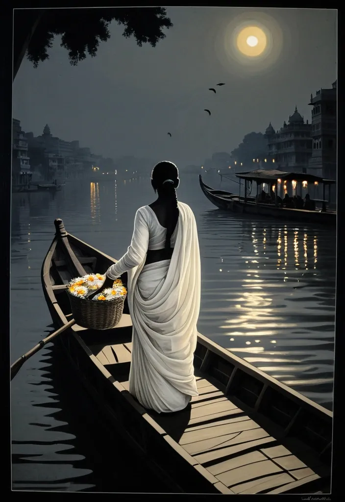 The scene shows a lone Aristocratic woman on a wooden boat at Ganga river in Banaras , wearing a white Saree and holding a flower basket , viewed from behind. The composition captures the atmospheric contrast between her illuminated figure and the shadowy , indistinct figures in the background , with selective lighting creating the tense , In the style of Relativity by the Dutch artist M. C. Escher , quiet mood you described in the 9:16 aspect ratio. ,