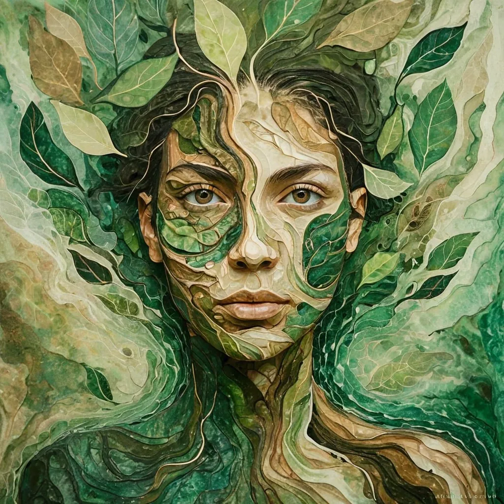 An abstract interpretation of human transformation , where a fragmented face begins to merge with swirling environmental patterns of water and leaves. The background is a painterly blend of earthy tones and vibrant greens , suggesting a deep connection between humanity and nature. The overall feeling is one of organic growth and metamorphosis , executed in a loose , expressive painterly style. ,