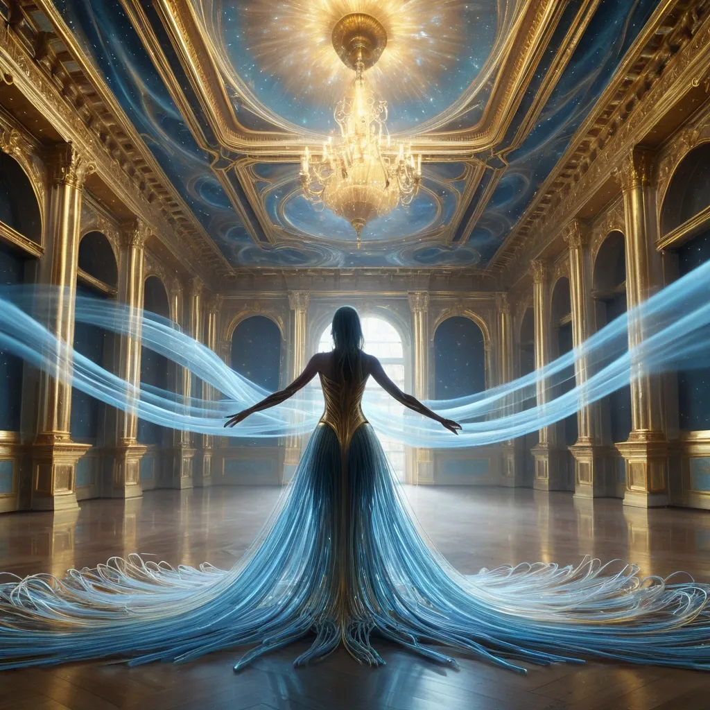 Imagine a surreal cosmic dancer where ribbons of metallic strands flow effortlessly through the vastness of space , their reflective surfaces glinting with otherworldly allure. These strands undulate with a dreamlike quality , as echo-like ripples of soft blue-gold gradient lighting weave through the air , casting gentle illuminations that dance across the scene. Surrounding the ribbons , harmonic mechanical waves pulse rhythmically , creating a mesmerizing atmosphere of motion blur that enhances the ethereal experience. The interplay of light and shadow lends depth to the fabric of space , enveloping the viewer in a tranquil yet vibrant dreamscape. Capture this vision in a gilded ballroom during the Georgian era , with a touch of surrealism to bring the wonder of this celestial artwork to life. ,
