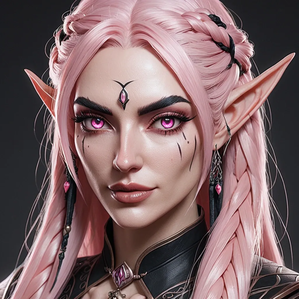 Generate a dungeons and dragons character portrait of the face of a femme nonbinary half eladrin elf half human with a delicate appearance. She is a thief and warlock. Her hair-color is rose-quartz pink and she has a few small braids and ribbons throughout her long straight otherwise unadorned hair that runs to her waist. she has bright black eyes and a little bit of an east asian look to her features , a sly and mischievous smile , with thick arched brows , gleaming clever and naughty eyes , heart shaped face. ,