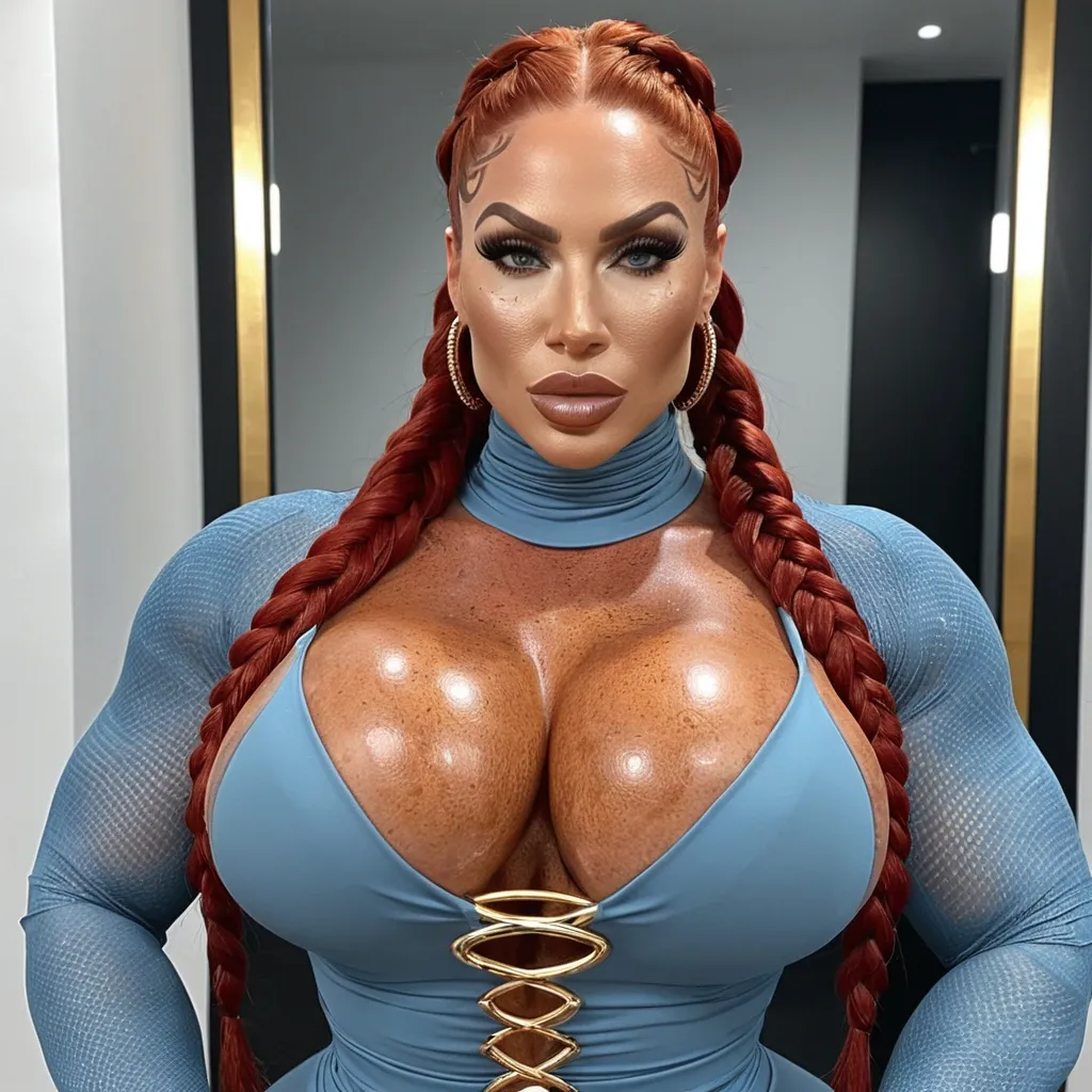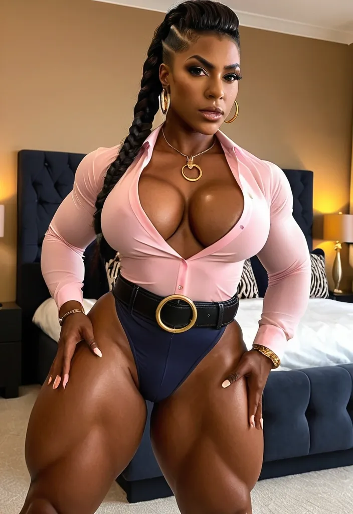 Generate a dark-skinned , pointy face African-American woman , gorgeous female boss , bimbo , hourglass body , abnormally massive female bodybuilder , gorgeous , close up , full lips , big booty , black hair , Mohawk braided design hair , bald on the side , feminine silhouette , too big breast , big booty , sexy thighs abs , silhouette , up close , flexing biceps , beautiful light-hazel eyes , legs are iconic and defining physical feature , both visually and in terms of combat ability.wearing an outfit that is a striking blend of elegance , power , and femininity , designed to command attention in any room. outfit in this image is a modern , giving it both structure and a touch of relaxed style. highlighting her curves while keeping the look balanced and versatile. Its neutral tone contrasts nicely against the blue denim , keeping the ensemble cohesive without overpowering the statement of the.Completing the polished and fashionable. Together , the outfit blends everyday comfort with bold , confident styling. This is the kind of ensemble that speaks to ambition , sophistication , and personal style—ideal for someone who thrives in positions of influence but insists on expressing her individuality with bold elegance. It’s not just clothing—it’s a statement of power wrapped in grace. The outfit is a vibrant lime-green lace bodysuit with a bold , intricate floral pattern that clings tightly to the body , accentuating every curve. It features a one-shoulder asymmetrical neckline and is semi-sheer , blending sensuality with a tropical , summery vibe. The high-cut leg design elongates the silhouette , while the delicate lace texture adds a touch of elegance and playfulness. Paired with a natural outdoor backdrop of lush greenery , the look is striking , confident , and unapologetically eye-catching. ,