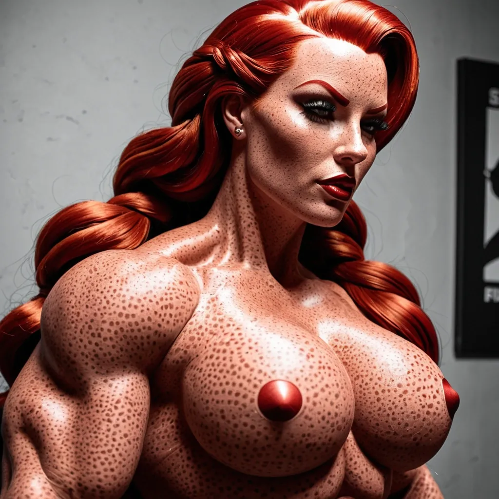 Generate Gorgeous female 1940s superhero , bimbo , hourglass body , abnormally massive female bodybuilder , gorgeous , close up , full lips , big booty , redheaded , freckles on face and breast , braided design hair , feminine silhouette , too big breast , big booty , sexy thighs abs , silhouette , up close , flexing biceps , beautiful green eyes , legs are iconic and defining physical feature , both visually and in terms of combat ability.wearing an outfit that is a striking blend of elegance , power , and femininity , designed to command attention in any room. The suit is tailored to perfection , hugging the wearer’s curves with precision while emphasizing a structured silhouette. The fabric itself is a refined grey tweed patterned with subtle white grid lines , giving the suit a texture that feels both sophisticated and modern. The blazer features broad blue lapels and gold button accents , adding a luxurious touch that elevates the look beyond typical business attire. The matching high-waisted trousers elongate the frame , further enhancing the poised and commanding effect of the ensemble.The styling choices amplify the boldness of the suit. The inner blouse is a silky , greybutton-down shirt that complements the tweed’s tone while introducing a softer , feminine balance to the sharp tailoring of the jacket. The blouse peeks out neatly from under the blazer , maintaining elegance without drawing focus away from the suit’s commanding cut. Accessories are kept minimal yet intentional: a delicate layered gold necklace and hoop earrings that add glimmers of light and luxury without overpowering the outfit. The choice of voluminous , honey-brown braids cascading down her shoulders frames the face with both confidence and glamour , completing the commanding visual.Altogether , this look communicates a blend of authority and allure. It is business-ready yet fashion-forward , balancing corporate structure with vibrant femininity. The color palette blue , grey and gold avoids being overly delicate , instead embracing the richness of texture , structure , and presence. This is the kind of ensemble that speaks to ambition , sophistication , and personal style—ideal for someone who thrives in positions of influence but insists on expressing her individuality with bold elegance. It’s not just clothing—it’s a statement of power wrapped in grace. In luxury living legs that could crush a watermelon , golden eagle emblem om his chest , , cape , bodysuit , high boots , stacked , enormous breast , stacked feminine silhouette ,