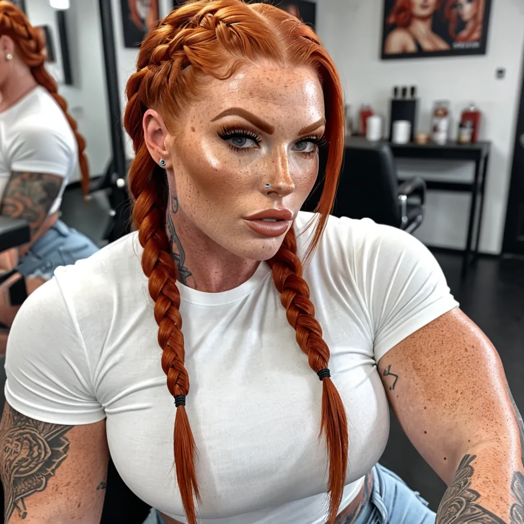 Generate Gorgeous female boss , bimbo , hourglass body , abnormally massive female bodybuilder , gorgeous , close up , full lips , big booty , redheaded , freckles on face and breast , braided design hair , feminine silhouette , too big breast , big booty , sexy thighs abs , silhouette , up close , flexing biceps , beautiful green eyes , legs are iconic and defining physical feature , both visually and in terms of combat ability.wearing an outfit that is a striking blend of elegance , power , and femininity , designed to command attention in any room. The suit is tailored to perfection , hugging the wearer’s curves with precision while emphasizing a structured silhouette. The fabric itself is a refined grey tweed patterned with subtle white grid lines , giving the suit a texture that feels both sophisticated and modern. The blazer features broad blue lapels and gold button accents , adding a luxurious touch that elevates the look beyond typical business attire. The matching high-waisted trousers elongate the frame , further enhancing the poised and commanding effect of the ensemble.The styling choices amplify the boldness of the suit. The inner blouse is a silky , greybutton-down shirt that complements the tweed’s tone while introducing a softer , feminine balance to the sharp tailoring of the jacket. The blouse peeks out neatly from under the blazer , maintaining elegance without drawing focus away from the suit’s commanding cut. Accessories are kept minimal yet intentional: a delicate layered gold necklace and hoop earrings that add glimmers of light and luxury without overpowering the outfit. The choice of voluminous , honey-brown braids cascading down her shoulders frames the face with both confidence and glamour , completing the commanding visual.Altogether , this look communicates a blend of authority and allure. It is business-ready yet fashion-forward , balancing corporate structure with vibrant femininity. The color palette blue , grey and gold avoids being overly delicate , instead embracing the richness of texture , structure , and presence. This is the kind of ensemble that speaks to ambition , sophistication , and personal style—ideal for someone who thrives in positions of influence but insists on expressing her individuality with bold elegance. It’s not just clothing—it’s a statement of power wrapped in grace. In luxury living legs that could crush a watermelon , skirt high boots are a bold and striking statement piece , crafted in glossy black patent leather that gives them a sleek , polished finish. Rising to just below the knee , the boots feature three adjustable buckle straps along the shaft , adding both edge and detail to their design. The towering stiletto heel , paired with a thick platform sole , creates an ultra-dramatic silhouette that elongates the leg and exudes power and confidence. With their combination of shine , height , and structure , these boots perfectly balance fierce femininity with high-fashion allure , white t-shirt , and blue jean shorts in barbershop , freckles , ginger hair ,
