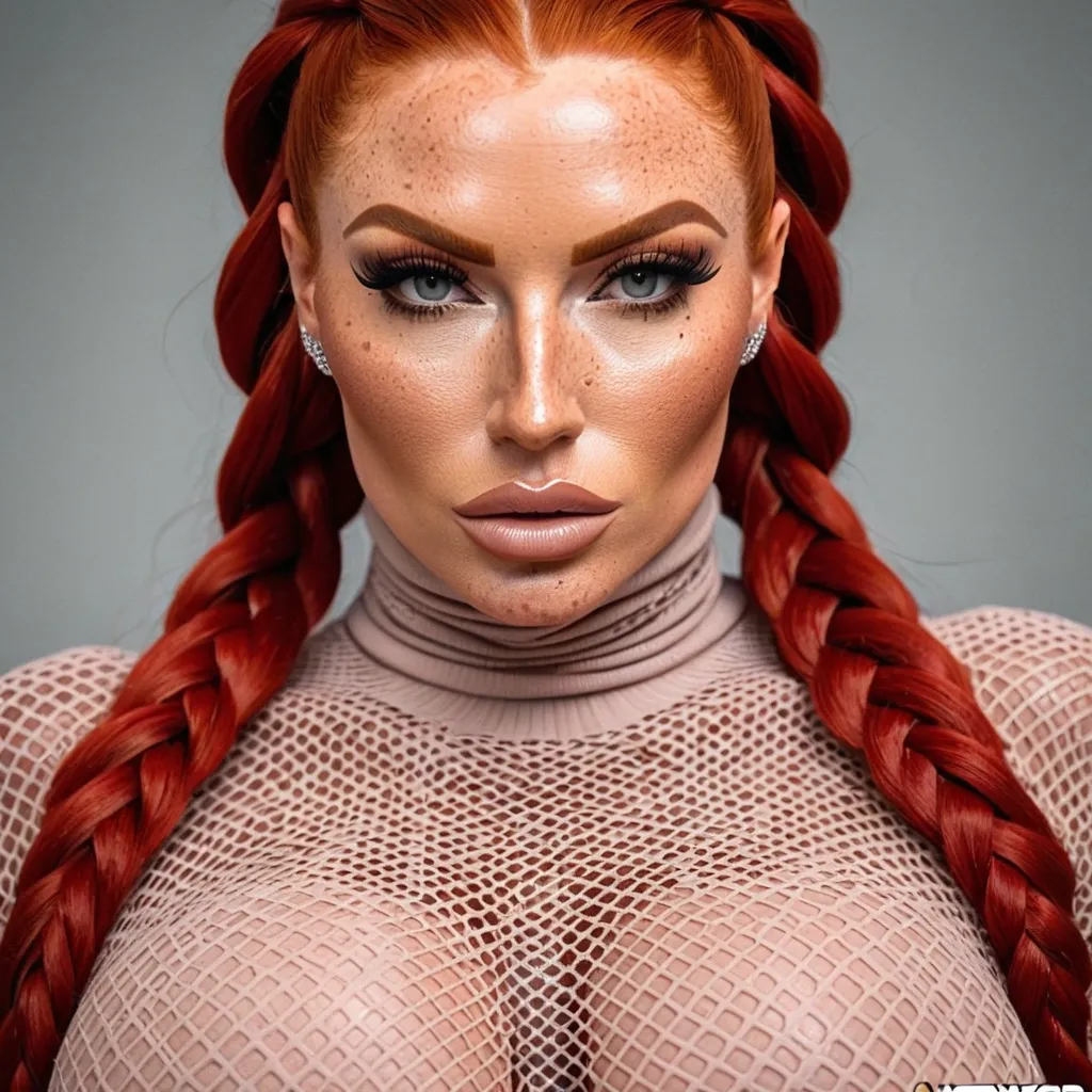 Generate Gorgeous female boss , bimbo , hourglass body , abnormally massive female bodybuilder , gorgeous , close up , full lips , big booty , redheaded , freckles on face and breast , braided design hair , feminine silhouette , too big breast , big booty , sexy thighs abs , silhouette , up close , flexing biceps , beautiful green eyes , legs are iconic and defining physical feature , both visually and in terms of combat ability.wearing an outfit that is a striking blend of elegance , power , and femininity , designed to command attention in any room. The suit is tailored to perfection , hugging the wearer’s curves with precision while emphasizing a structured silhouette. The fabric itself is a refined grey tweed patterned with subtle white grid lines , giving the suit a texture that feels both sophisticated and modern. The blazer features broad blue lapels and gold button accents , adding a luxurious touch that elevates the look beyond typical business attire. The matching high-waisted trousers elongate the frame , further enhancing the poised and commanding effect of the ensemble.The styling choices amplify the boldness of the suit. The inner blouse is a silky , greybutton-down shirt that complements the tweed’s tone while introducing a softer , feminine balance to the sharp tailoring of the jacket. The blouse peeks out neatly from under the blazer , maintaining elegance without drawing focus away from the suit’s commanding cut. Accessories are kept minimal yet intentional: a delicate layered gold necklace and hoop earrings that add glimmers of light and luxury without overpowering the outfit. The choice of voluminous , honey-brown braids cascading down her shoulders frames the face with both confidence and glamour , completing the commanding visual.Altogether , this look communicates a blend of authority and allure. It is business-ready yet fashion-forward , balancing corporate structure with vibrant femininity. The color palette blue , grey and gold avoids being overly delicate , instead embracing the richness of texture , structure , and presence. This is the kind of ensemble that speaks to ambition , sophistication , and personal style—ideal for someone who thrives in positions of influence but insists on expressing her individuality with bold elegance. It’s not just clothing—it’s a statement of power wrapped in grace. In luxury living legs that could crush a watermelon , skirt high boots are a bold and striking statement piece , crafted in glossy black patent leather that gives them a sleek , polished finish. Rising to just below the knee , the boots feature three adjustable buckle straps along the shaft , adding both edge and detail to their design. The towering stiletto heel , paired with a thick platform sole , creates an ultra-dramatic silhouette that elongates the leg and exudes power and confidence. With their combination of shine , height , and structure , these boots perfectly balance fierce femininity with high-fashion allure. Turtleneck ,
