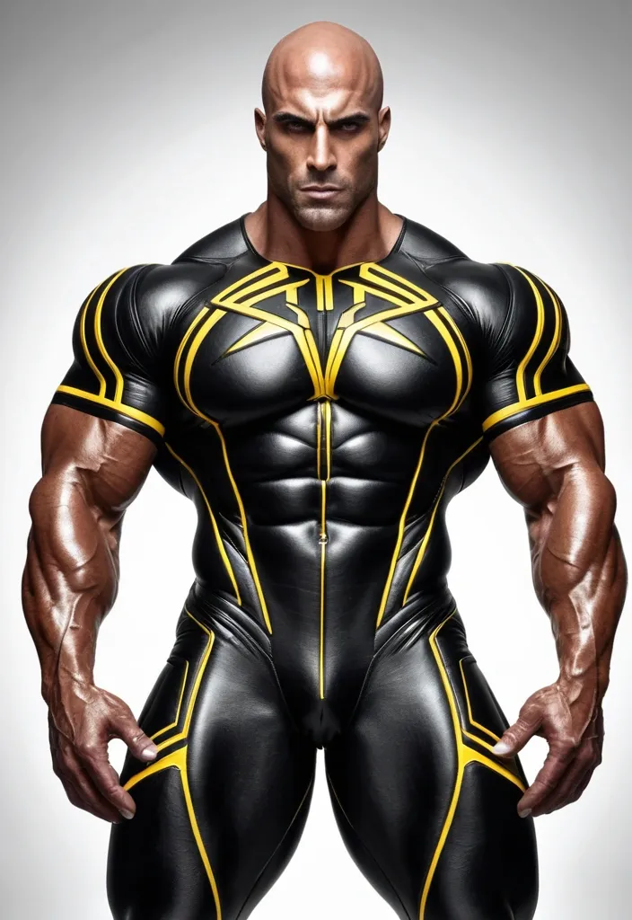 Ambiguous man , no ethnicity or race affiliation. Light brown , colored skinned his eyes are large , light-hazel , almond-shaped , and a striking gorgeous heavily emphasized with long lashes and a piercing gaze that looks directly at the viewer. The sclera is bright white , the irises detailed with radial patterns and tiny highlights , giving them an almost luminous quality. There is a slight upward tilt at the outer corners , enhancing commanding expression. The eyebrows are thick , perfectly arched , and dark framing the eyes dramatically.Her body is the most exaggerated aspect of the image , his bald-headed , built to extreme proportions that combine hyper-muscularity with hyper-masculinity physique . Shoulders are broad and powerfully capped , arms thick with vascular , sculpted muscle , and abs are deeply etched in an almost anatomical level of definition. Yet the waist remains improbably narrow before flaring into extremely wide pecks and massive , rounded glutes. The chest is enormously enlarged far beyond natural human proportions , defying both gravity and realism , with the white wrap struggling to contain it. Every muscle is highlighted with glossy oil-like shine , emphasizing separation and size; the overall physique is a fantasy hybrid of competitive male bodybuilder and exaggerated alpha male pin-up. Portion body and shredded. Futuristic black and yellow designed leather bodysuit , padded boots and padded leather chest plate. Futuristic black and yellow designed leather bodysuit , padded boots and padded leather chest plate Futuristic black and yellow designed leather bodysuit , padded boots and padded leather chest plate , black and leather pants , and padded leather boots ,