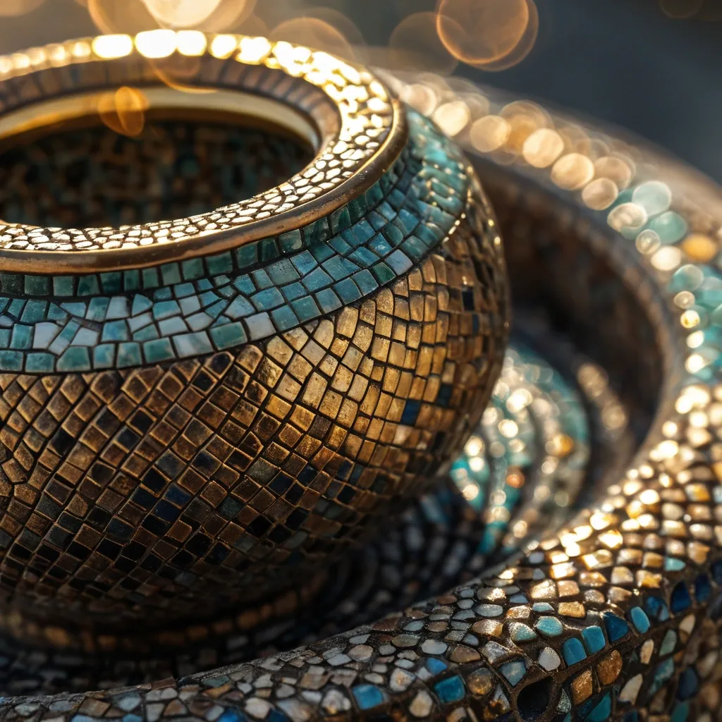 Extreme close-up of weathered , mosaic-art ceramic on a traditional styles Smoking pipe , head with golden ring , dissolving into sparkling smokes. Tiny fissures catch the golden-light , revealing layers of subtle color and texture beneath the surface. The focus is on the delicate interplay of light and shadow across the granular surface , highlighting imperfections. Photo-realistic rendering with macro photography aesthetic , emphasizing tactile surface detail. ,