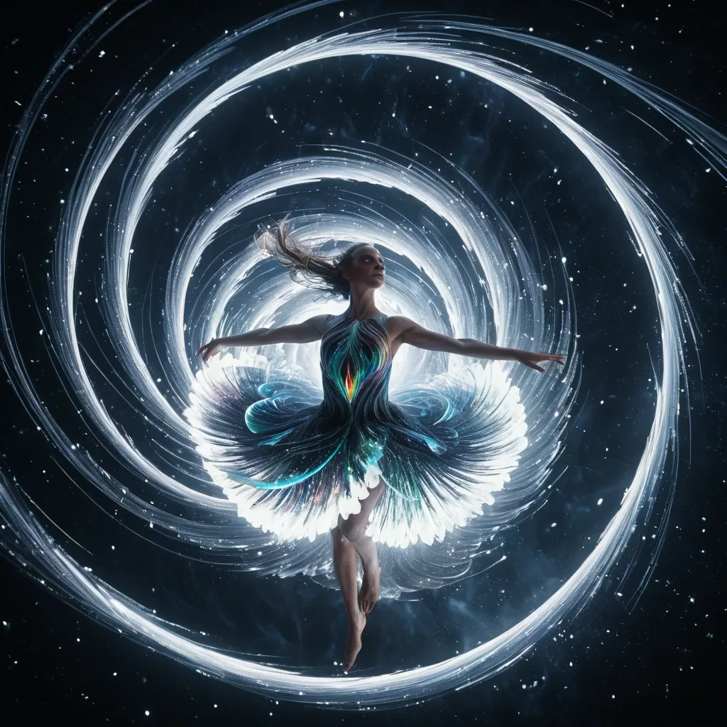 Aerial view , top-down view. Background: deep space with auditorium. Foreground: soft light trails forming arcs. Hero subject: dancer in dynamic motion , vortex dress made of peacock feathers patterns and a rainbow vortex that seem to stretch across the surface , flowing pose. Style: Celestial , ethereal , abstract , digital art Lighting: Dramatic backlighting , bright glowing particles , contrasting dark background Composition: dynamic diagonal , composition , upward gaze Details: Sparkling white waves , vortex white smoke trails , sense of movement and wonder , magical atmosphere Quality: High detail , 4K , Masterpiece , Rendered in Octane. ,