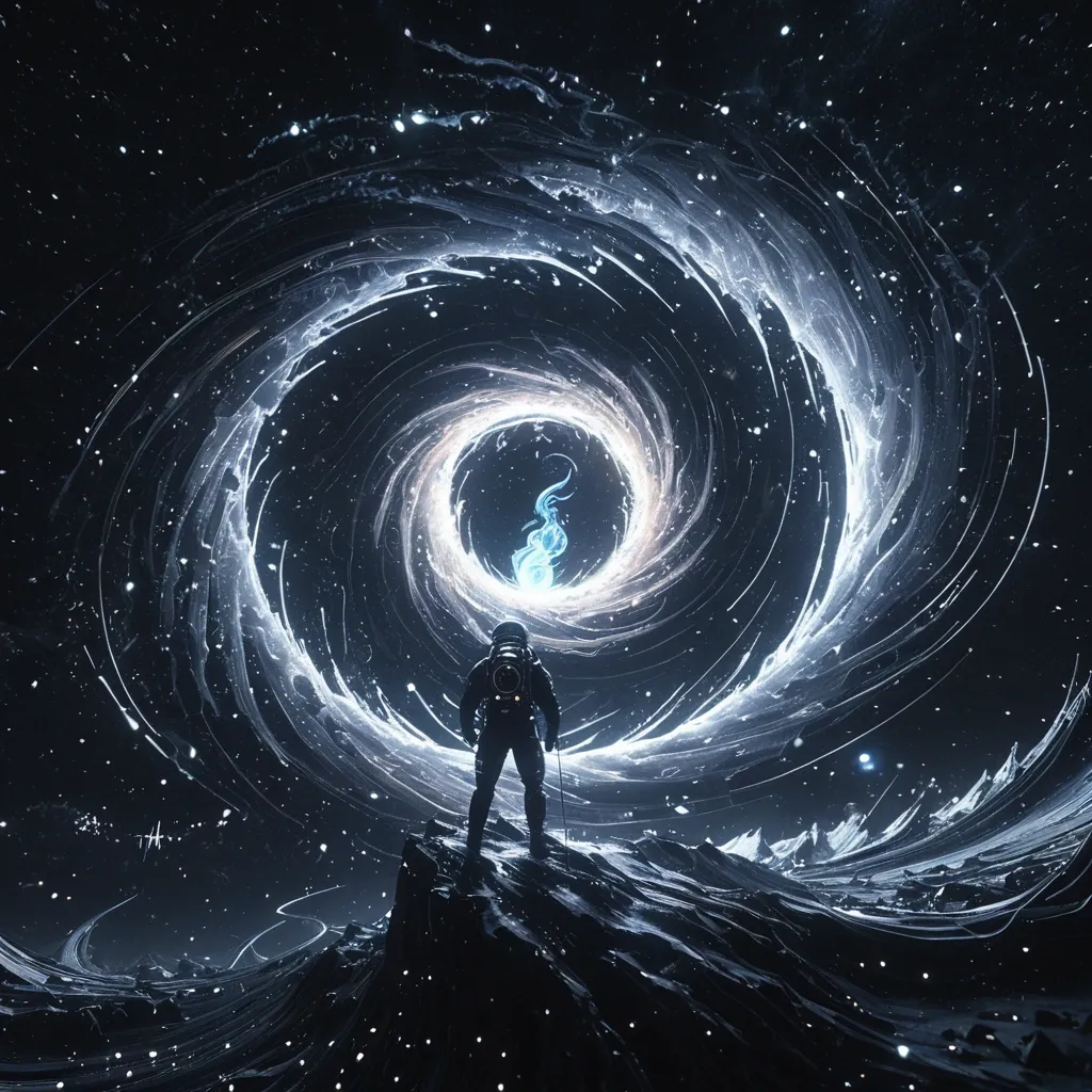 A swirling vortex of darkness , a Sora logo maw opens wide , devouring a solar system in a cosmic dance of gravity and light , as stars and planets are consumed by an eternal , abyssal void , a tiny astronaut fly in center. style: ethereal , abstract , digital art smoking: Dramatic backlighting , bright glowing particles , contrasting dark background Composition: dynamic diagonal composition , upward gaze Details: Sparkling white waves and smoke , streaking white light trails , sense of movement and wonder , magical atmosphere Quality: High detail , 4K , Masterpiece , Rendered in Octane. ,
