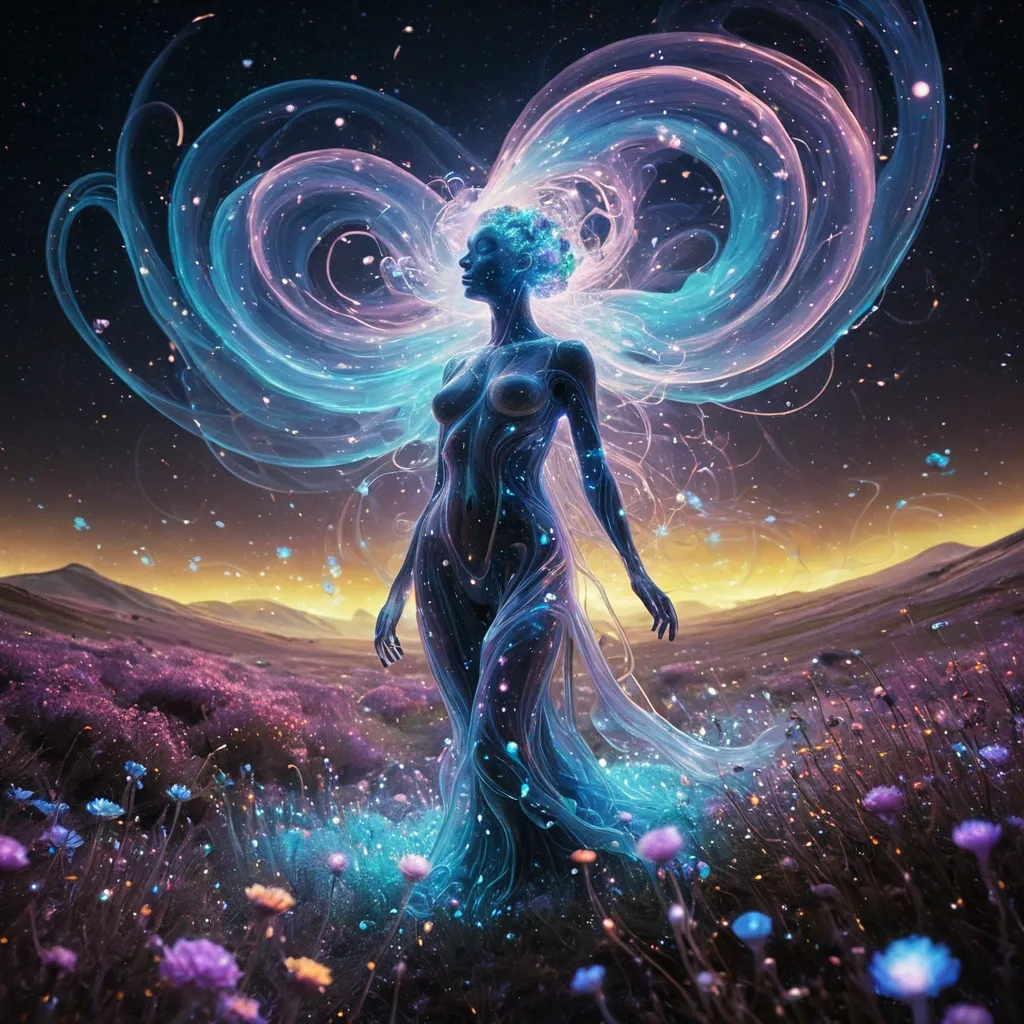 An ethereal figure , composed of swirling light and cosmic dust , undergoes a beautiful transformation , dissolving into a field of bioluminescent flowers on a distant exoplanet. The scene is depicted with surrealism , emphasizing fluidity and the blending of organic and cosmic elements. The lighting is soft and otherworldly , with a focus on vibrant , glowing colors. ,