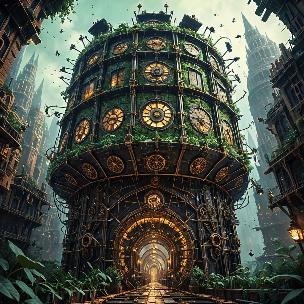 A majestic clockwork group of ants has successfully transported a Paneer slice , larger than any of them , back to their colony entrance. The scene is depicted from a worm's-eye view , making the Paneer slice appear monumental and the ants' effort heroic. Tiny tools , fashioned from twigs and leaves , are visible around the Paneer slice. The background is a soft blur of green foliage , emphasizing the small scale of the achievement. The style is a fusion of steampunk aesthetics , hyper-realistic rendering of metallic textures , and a touch of dark fantasy , inspired by the detailed mechanical designs of Ian McQue and the atmospheric cityscapes of Leonid Afremov. ,