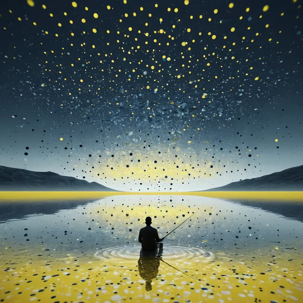 Creative water resembling a seascape-like in landscape , (3D rendering:1.1) Horizontal surreal composed of (white , blue and gray particles fading into the dark sky:1.1) , with a smaller flow , a silhouette fisherman sit on bot at center of lake rendered in a (dim-yellow dots reflecting on calm , reflective ground:1.2) , extending from the base of the structures into the foreground. (Surrealism:1.2). The water is smooth and blurred , creating a peaceful , dreamlike atmosphere. Soft , hyper-realistic textures , subtle color transitions , and a tranquil mood. ,