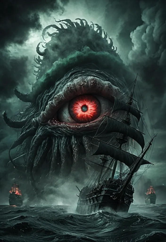 Emerging from this mist is a single giant pirate eye , its iris a vivid blend of red and green , the pupil dark and centered. The eyelashes are rendered with striking detail , tapering outward as though the pirate eye belongs to something alive hidden within the vapor. In the iris , a eyelid frame is partially embedded in the clouded sky , giant Kraken attacking. A large black torn sails ship in a epic way rough seas storm clouds Kraken seems to be winning. Fires on board ship men scrambled. To leave ship dull night light shimmering ,