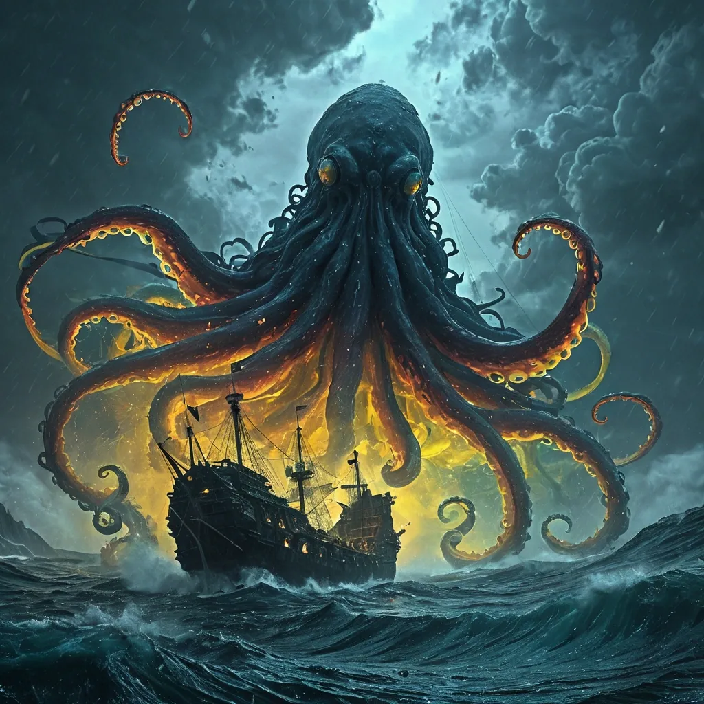 Debris—stones , dust , and fragments—rise from the ground , suspended within the turbulence. black sea and in front a silhouette of A giant kraken attacking. A large black torn sails ship in a epic way rough seas storm clouds kraken seems to be winning. Fires on board ship men scrambled. To leave ship dull night light shimmering enter in Squid with tentacles , (in the style of intricate collage , fauvist-fantasy , algorithmic artistry) appears to dissolve into a shifting , storm-like formation made of blues , greens , yellows , and muted reds. Emerging from this mist is a single giant Squid , its vivid blend of blue and yellow and centered. The helicopter-wings are rendered with striking detail , tapering outward as though the Squid belongs to something alive hidden within the vapor. The surrounding clouds billow up to the ceiling. ,