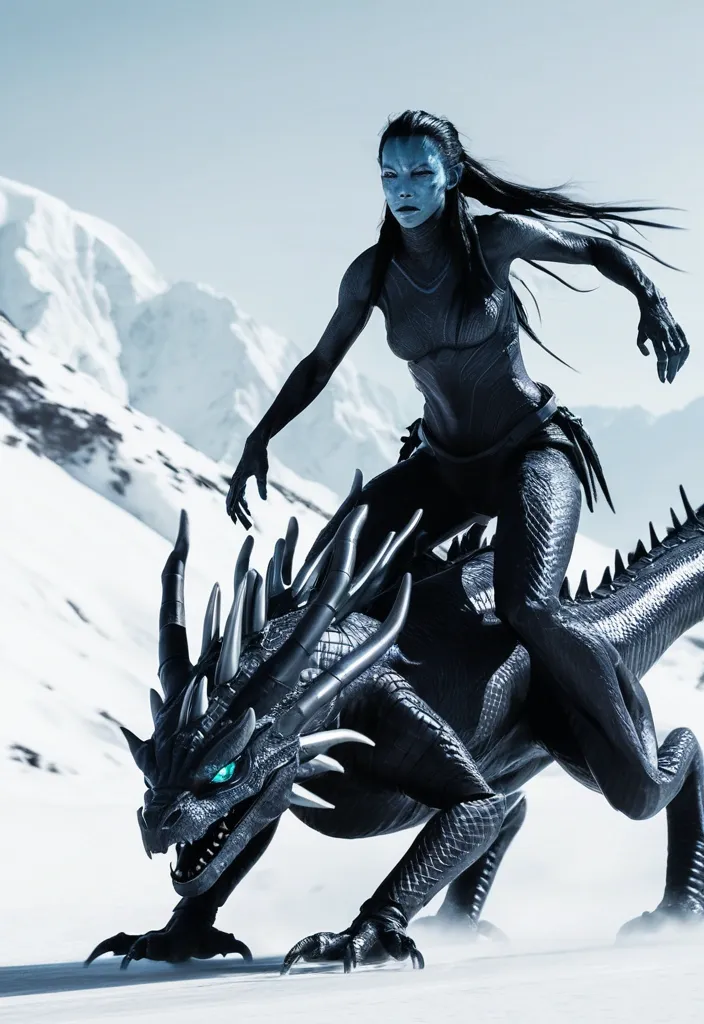 A female Na'vi , the indigenous humanoid species of Pandora , riding a massive black dragon , in motion , captured with a slow shutter for dynamic motion blur. High contrast , minimalist composition with no logos or text. snowy mountain range background , abstract , and energetic. Editorial style reminiscent of SpaceX advertising or street photography. ,