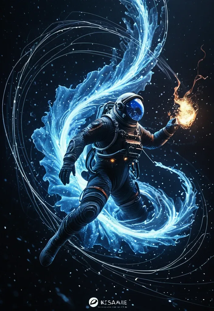 A swirling vortex of darkness , a Sora logo maw opens wide , devouring a solar system in a cosmic dance of gravity and light , sharp teeth , as stars and planets are consumed by an eternal , abyssal void , a tiny astronaut with fish-net in action-pose at left. style: ethereal , abstract , digital art smoking: Dramatic backlighting , bright glowing particles , contrasting dark background Composition: dynamic diagonal composition , upward gaze Details: Sparkling light-blue waves and smoke , streaking white light trails , sense of movement and wonder , magical atmosphere Quality: High detail , 4K , Masterpiece , Rendered in Octane. ,