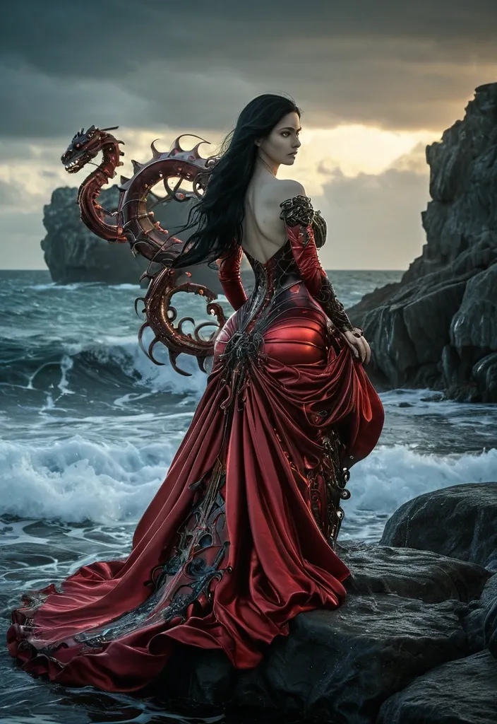 A dramatic scene featuring a woman and a dragon. The woman , with long , flowing , dark black hair cascading down her back , stands on a rocky , ocean terrain. She is dressed in a long , flowing red gown , which contrasts vividly with the water-waves surroundings , suggesting a sense of warmth and life amidst the cold. The gown's texture appears smooth and luxurious , made of a fabric that drapes elegantly around her figure. full body , ridiculous , cinema lights , (best medium photo of mechanical Octopus , (Crab motif) , green eyes , steampunk , intricate design , HDR (high dynamic range) , ray tracing , Albedo and Highlight Maps , Surface Shading , Accurate Simulation of Light-Material Interactions , Perfect Proportions , Octane Rendering , ,