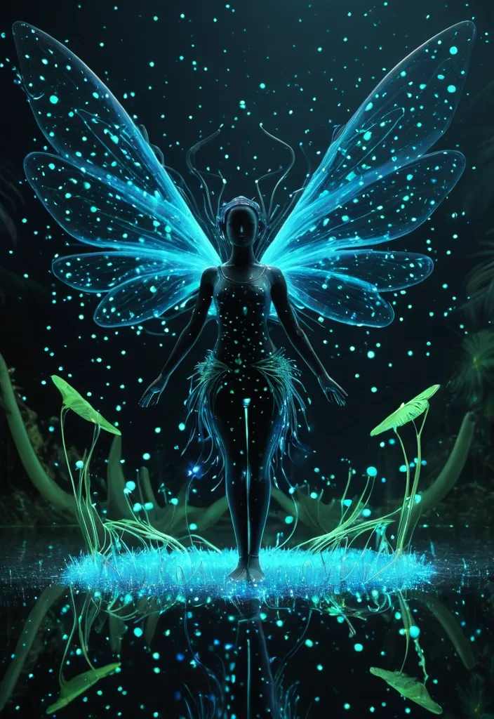 Creative dancer resembling with wings-like in vortex , (3D rendering:1.1) Horizontal surreal composed of (bioluminescent flora and fauna particles fading into the dark sky:1.1) , with a smaller flow , lighter (blue and green particle formation behind it diminishing in size:1.0) , a dancer rendered in (black dots reflecting on calm , reflective ground:1.2) , extending from the base of the structures into the foreground. breathing sculpture against a backdrop of a bioluminescent jungle. The air shimmers with magical energy , and the scene pulses with gentle light. ,