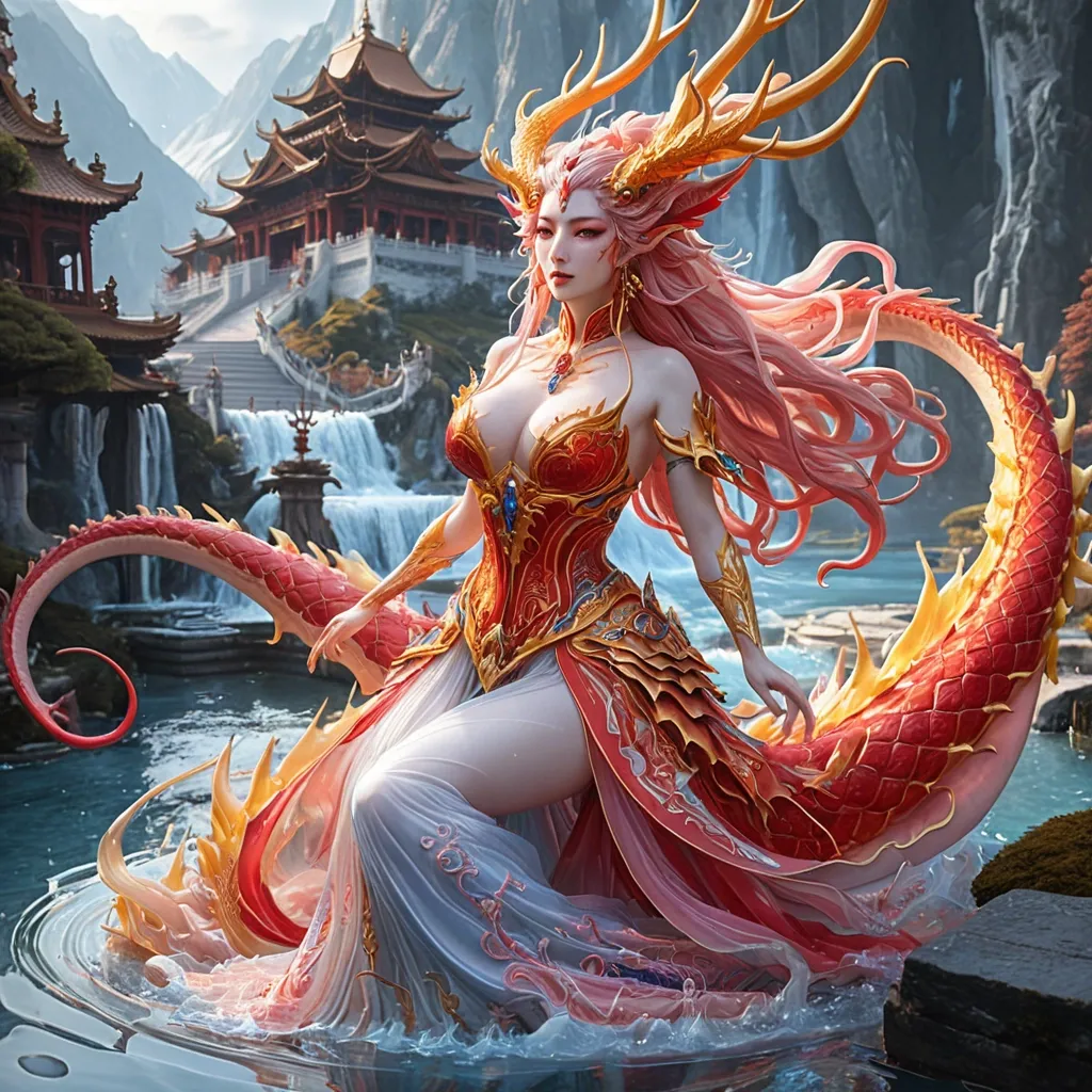 (masterpiece) , (best quality) , (super exquisite) , (illustration) , (extremely exquisite and beautiful) , (dynamic angle) , fiery red and white highlights , golden yellow lines ((palace)) , (legendary dragon: dragon lady , (first born antlers)) , (wearing transparent blue and pink gauze skirt , scales)) , flowing , (complex details) (beautiful and delicate eyes) , (extremely delicate facial features) , Floating hair , (dreamlike color) , (beautiful dragon girl) , seiza , wariza , round chest , cleavage , shoulder off , flowing , melting , water mist , intricate , octane rendering , incredible details , close-up , soft color , everything melts and flows , 8k ,