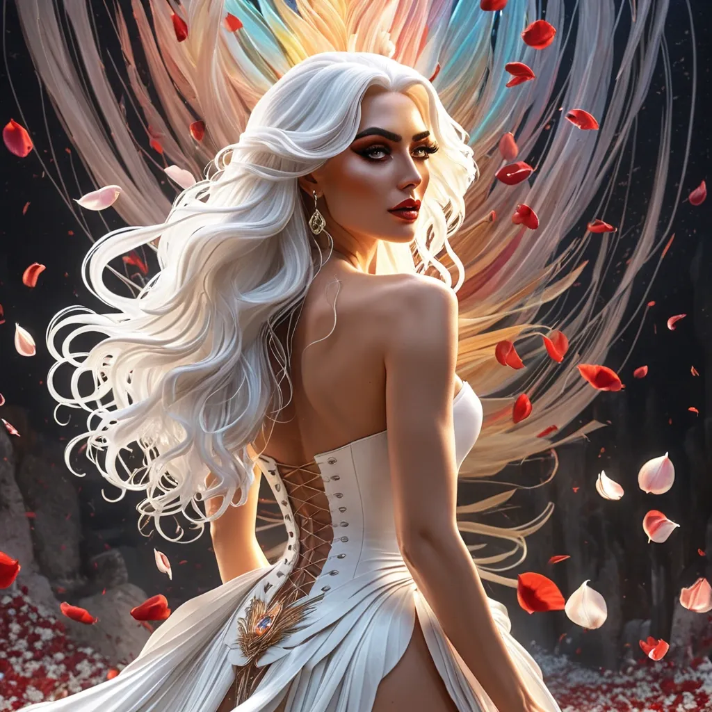 (exquisite facial depiction) ((by fax artist)) , ((1girl)) , (back) , (look back) , floating long hair , feathers , surrounding , colorful , wavy , surreal lifelike , top CG rendering , highest quality , masterpiece , 16k , master's work , highest quality , absurdres , transparent skin , white long hair , retro , peerless beauty , goddess , rose , Petals fluttering , golden big eyes delicately portrayed , lips delicately portrayed , white hair delicately portrayed , dynamic posture , messy hair , strapless high slit skirt , looking back , movie lighting , photo realism , stage background. ,