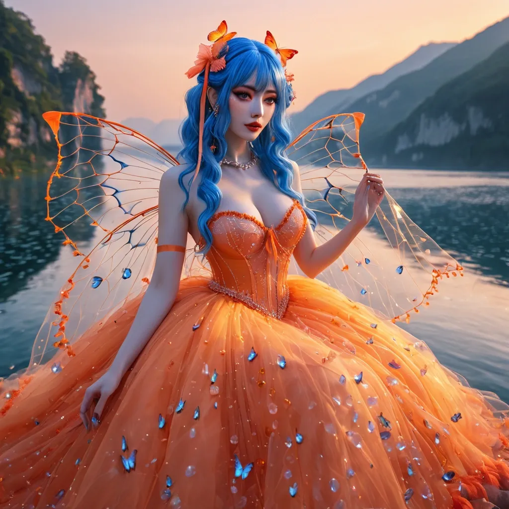 8k resolution , Masterpiece , top masterpiece , silk orange gradient skirt , aestheticism , carp girl , fluffy blue hair , luminescence , beads , hair ribbon , peach , longeyelashes , cute , nose blush , ultra-high definition , dreamlike , gorgeous , gentle , small , attractive , delicious , crystal clear , crystal , sweet , movie light , fishing net , tulle , butterfly , aestheticism ,