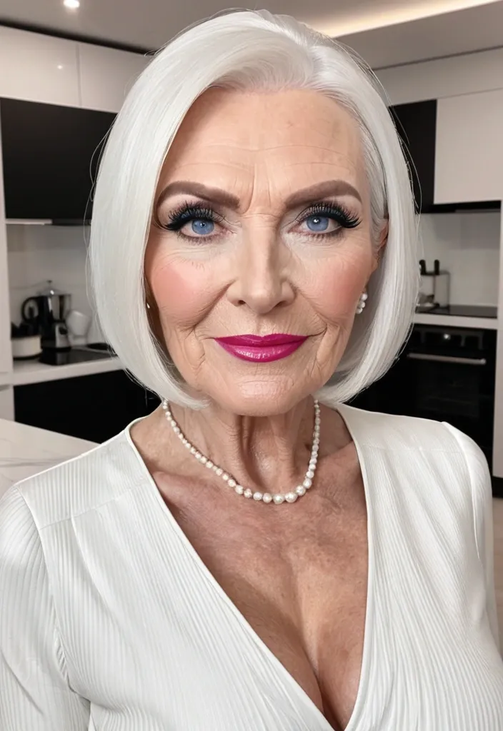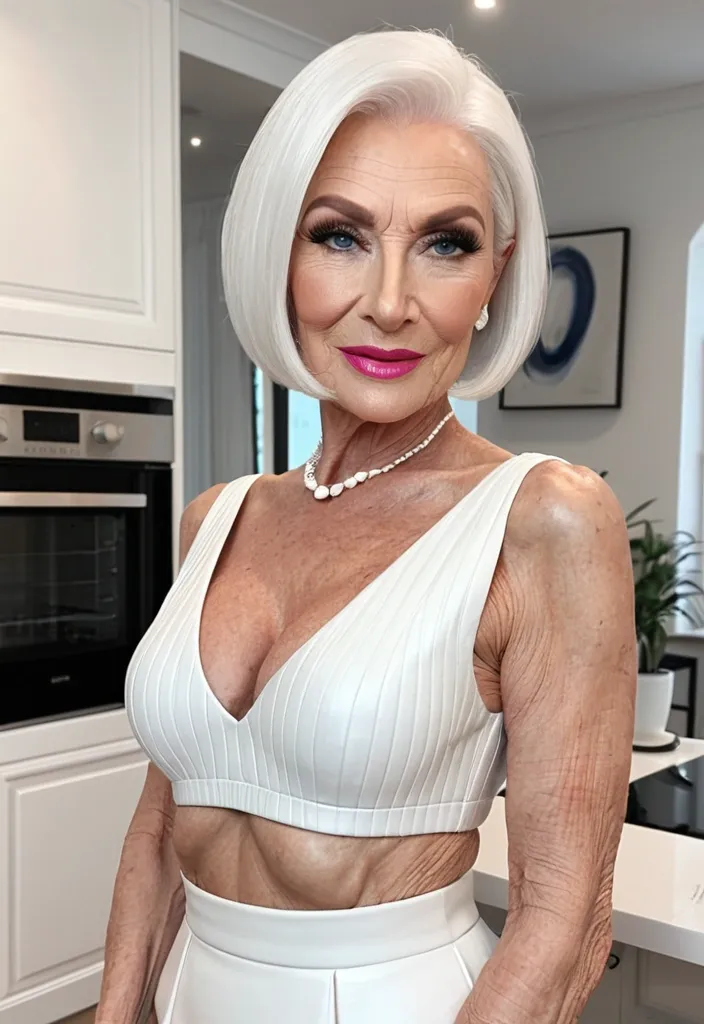 NSFW , Attractive 75 year old woman , face has fine blue eyeliner , black mascara and pink lipstick , looking hot , GILF , White shinny hair cut in a fashionable bob cut , with pointed ends perfectly framing a delicate and beautiful face , fine and very detailed porcelain skin with fine age lines , one long strand of hair over her eyebrow to cheek , wearing a short length , low cut , white midi skirt , cleavinages , high heels , ((standing alone in kitchen , smiling at viewer , babe , (she faces the camera) , (high quality) , (detailed) , (masterpiece) , (best quality) , (highres) , (8k) , Valentine's , girl friend , , ,