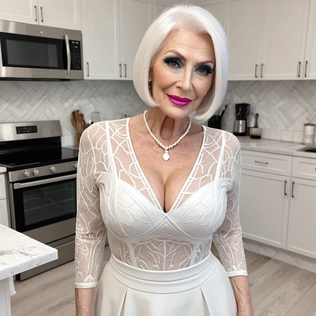 NSFW , Attractive 75 year old woman , face has fine blue eyeliner , black mascara and pink lipstick , looking hot , GILF , White shinny hair cut in a fashionable bob cut , with pointed ends perfectly framing a delicate and beautiful face , fine and very detailed porcelain skin with fine age lines , one long strand of hair over her eyebrow to cheek , wearing a short length , low cut , white midi skirt , cleavinages , high heels , ((standing alone in kitchen , smiling at viewer , babe , (she faces the camera) , (high quality) , (detailed) , (masterpiece) , (best quality) , (highres) , (8k) , Valentine's , girl friend , ,