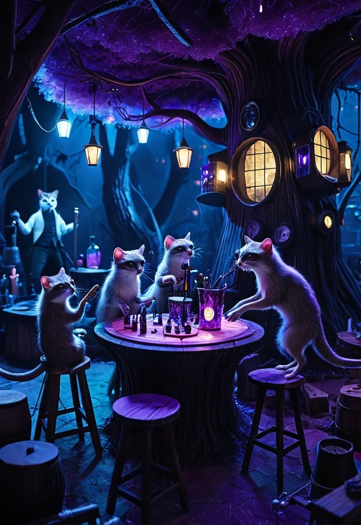 A family of stoats diligently operating a tiny , makeshift Dance bar hidden within a giant tree hollow , broadcasting musical signals into the night. young cat wears a makeshift tutu and dance , tables-chair , Musical instrument , and wine bottles are scattered around their miniature bar. cinematic fantasy atmosphere with deep blues and blacks contrasted by vivid electric purples and magentas. Glowing highlights , misty volumetric light , and glossy , high-detail textures. Balanced compositions with a strong central focus , dark surroundings , and saturated luminous accents that create an intense , magical mood. ,
