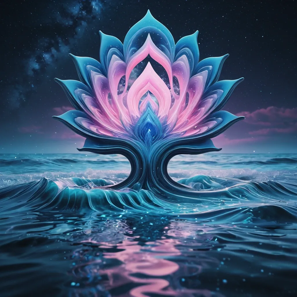 A landscape water Melting from a vortex drops rendered as a Fractal ocean. A large vortex of aurora reflected in ocean vortex water , a swastika symbol "卐" , materials made of Blue and pink and air , an abstract Lotus on an open palm against a starry sky. Style: ethereal , fluid , and deeply peaceful. An ultra-stylized and highly dramatic fashion editorial , rendered with a cinematic aesthetic. Shot on a Canon EOS R5. 8K. Zeiss Otus 85mm f/1.4 Planar T Lens. ,