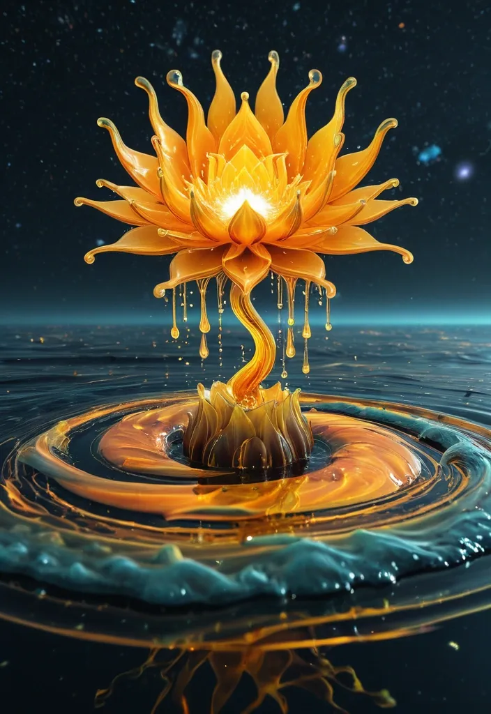 A landscape water Melting from a vortex drops rendered as a Fractal ocean. A large vortex of aurora reflected in ocean vortex water , a spiritual symbol "ॐ" , materials made of orange and yellow and air , an abstract Lotus on an open palm against a starry sky. Style: ethereal , fluid , and deeply peaceful. An ultra-stylized and highly dramatic fashion editorial , rendered with a cinematic aesthetic. Shot on a Canon EOS R5. 8K. Zeiss Otus 85mm f/1.4 Planar T Lens. ,
