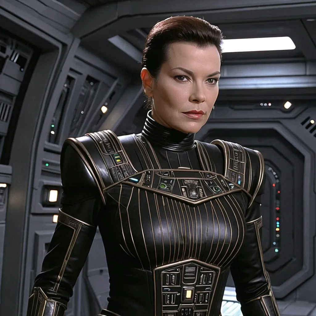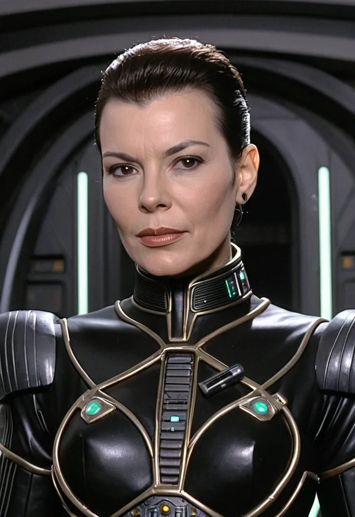 masterpiece photorealistic full lenght a beautiful japanese female with straight shoulder brown hair in her mid twenties in black and red turtleneck sleeveless zipper swimsuit , gentle smile , standing in a futuristic dark space station bedroom with japanese influence , science fiction cinematic style ,