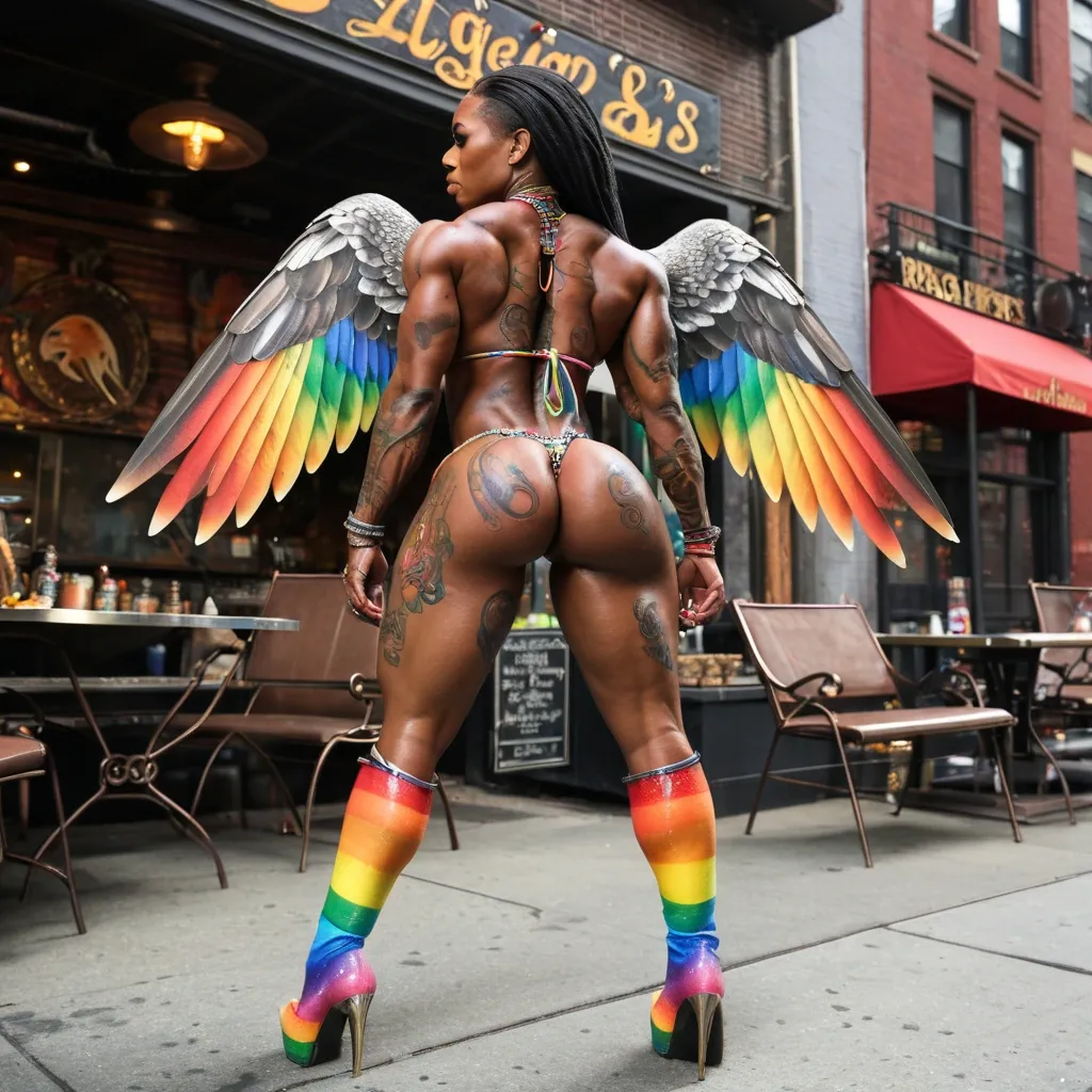 Rose James is a female ebony bodybuilder with a smoking hot body , completely sculpted and covered in tattoos while wearing a jewel-encrusted rainbow string bikini with real strings and rainbow thigh-high boots while showcasing her massive back tattoo of a peregrine falcon surrounded by wildlife that covers her entire back as she's in front of her BBQ restaurant in NYC called Falcon's fire. ,