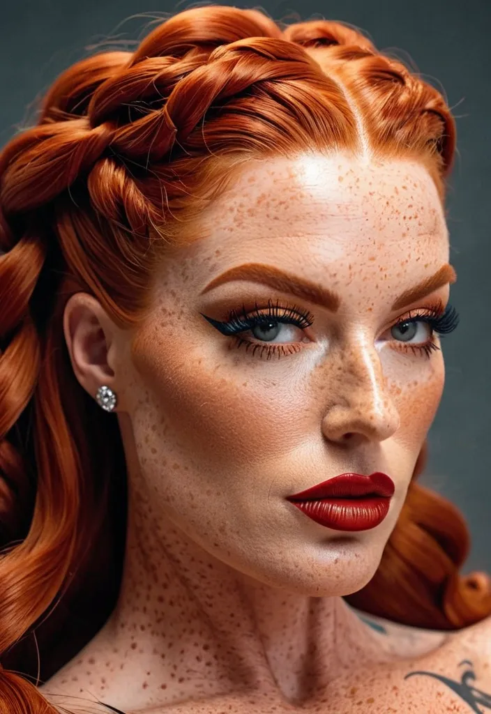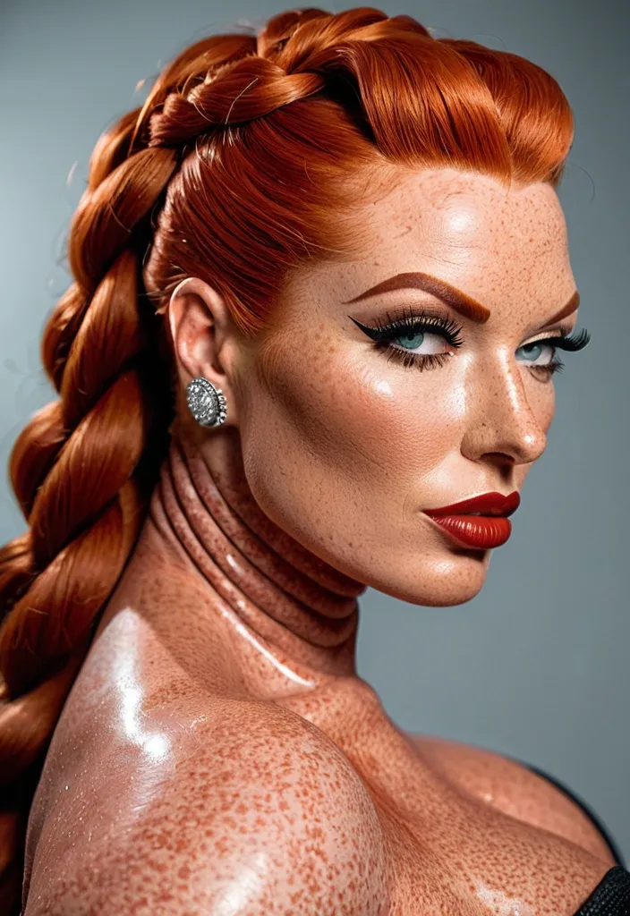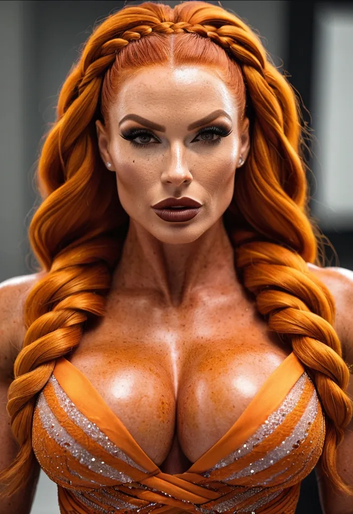 Generate Gorgeous female boss , Caucasian woman , bimbo , hourglass body , abnormally massive female bodybuilder , gorgeous , close up , full lips , big booty , redheaded , freckles on face and breast , braided design hair , feminine silhouette , too big breast , big booty , sexy thighs abs , silhouette , up close , flexing biceps , big beautiful vivid green eyes , legs are iconic and defining physical feature , both visually and in terms of combat ability.wearing an outfit that is a striking blend of elegance , power , and femininity , designed to command attention in any room. The suit is tailored to perfection , hugging the wearer’s curves with precision while emphasizing a structured silhouette. The fabric itself is a refined grey tweed patterned with subtle white grid lines , giving the suit a texture that feels both sophisticated and modern. The blazer features broad blue lapels and gold button accents , adding a luxurious touch that elevates the look beyond typical business attire. The matching high-waisted trousers elongate the frame , further enhancing the poised and commanding effect of the ensemble.The styling choices amplify the boldness of the suit. The inner blouse is a silky , greybutton-down shirt that complements the tweed’s tone while introducing a softer , feminine balance to the sharp tailoring of the jacket. The blouse peeks out neatly from under the blazer , maintaining elegance without drawing focus away from the suit’s commanding cut. Accessories are kept minimal yet intentional: a delicate layered gold necklace and hoop earrings that add glimmers of light and luxury without overpowering the outfit. The choice of voluminous , honey-brown braids cascading down her shoulders frames the face with both confidence and glamour , completing the commanding visual.Altogether , this look communicates a blend of authority and allure. It is business-ready yet fashion-forward , balancing corporate structure with vibrant femininity. The color palette orange , gray and gold avoids being overly delicate , instead embracing the richness of texture , structure , and presence. This is the kind of ensemble that speaks to ambition , sophistication , and personal style—ideal for someone who thrives in positions of influence but insists on expressing her individuality with bold elegance. It’s not just clothing—it’s a statement of power wrapped in grace. ,