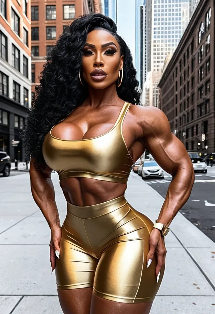 Generate Gorgeous female boss , , bimbo , hourglass body , golden brown skim complexion. abnormally massive female bodybuilder , gorgeous , close up , full lips , big booty , black hair , Philippine woman , black pompadour stylish hair , feminine silhouette , too big breast , big booty , sexy thighs abs , silhouette , up close , flexing biceps , beautiful green eyes , legs are iconic and defining physical feature , both visually and in terms of combat ability.wearing an outfit that is a striking blend of elegance , power , and femininity , designed to command attention in any room. The suit is tailored to perfection , hugging the wearer’s curves with precision while emphasizing a structured silhouette. The fabric itself is a refined grey tweed patterned with subtle white grid lines , giving the suit a texture that feels both sophisticated and modern. The blazer features broad blue lapels and gold button accents , adding a luxurious touch that elevates the look beyond typical business attire. The matching high-waisted trousers elongate the frame , further enhancing the poised and commanding effect of the ensemble.The styling choices amplify the boldness of the suit. The inner blouse is a silky , greybutton-down shirt that complements the tweed’s tone while introducing a softer , feminine balance to the sharp tailoring of the jacket. The blouse peeks out neatly from under the blazer , maintaining elegance without drawing focus away from the suit’s commanding cut. Accessories are kept minimal yet intentional: a delicate layered gold necklace and hoop earrings that add glimmers of light and luxury without overpowering the outfit. The choice of voluminous , honey-brown braids cascading down her shoulders frames the face with both confidence and glamour , completing the commanding visual.Altogether , this look communicates a blend of authority and allure. It is business-ready yet fashion-forward , balancing corporate structure with vibrant femininity. The color palette blue , grey and gold avoids being overly delicate , instead embracing the richness of texture , structure , and presence. This is the kind of ensemble that speaks to ambition , sophistication , and personal style—ideal for someone who thrives in positions of influence but insists on expressing her individuality with bold elegance. It’s not just clothing—it’s a statement of power wrapped in grace. In luxury living legs that could crush a watermelon , skirt high boots are a bold and striking statement piece , crafted in glossy black patent leather that gives them a sleek , polished finish. Rising to just below the knee , the boots feature three adjustable buckle straps along the shaft , adding both edge and detail to their design. The towering stiletto heel , paired with a thick platform sole , creates an ultra-dramatic silhouette that elongates the leg and exudes power and confidence. With their combination of shine , height , and structure , these boots perfectly balance fierce femininity with high-fashion allure. High cheekbones , prominent jawline , gorgeous big brown eyes , powerful curves , enormous breast , sitting beige tank top , blue jean shorts , voluptuous , inside nail saloon up close shot , ,