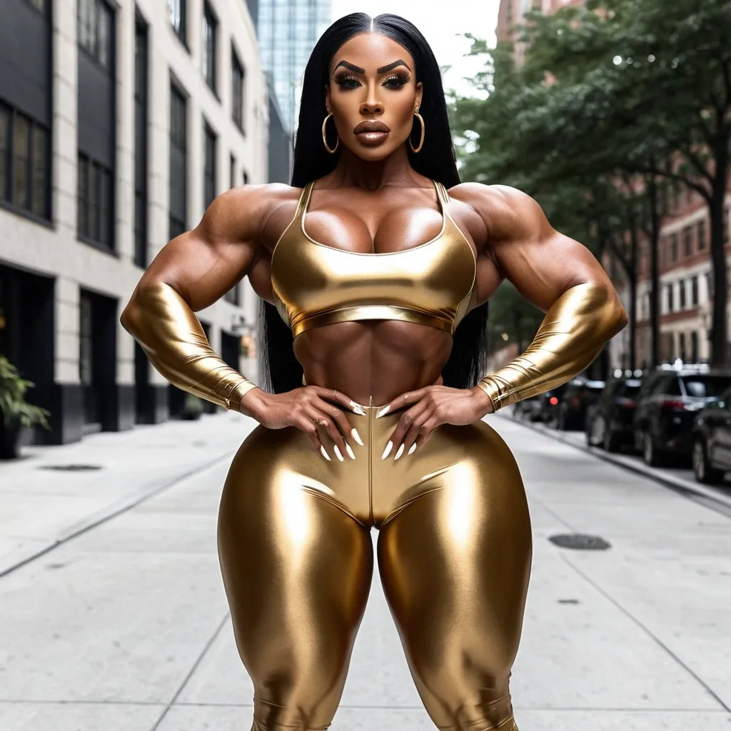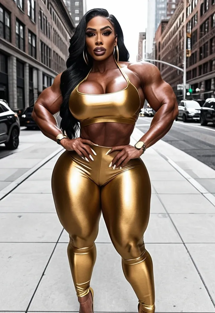 Generate Gorgeous female boss , African-American woman , 24 years old , Adrienne-Joi Johnson , abnormally massive female bodybuilder , gorgeous , close up , full lips , big booty , feminine silhouette , too big breast , enormous breast , beautiful brown eyes , black and purple hair styled designed bald-headed on the side with braids on top of head , big booty , curvy hips , toned legs , legs are famously muscular , thick , and powerful , showcasing years of intense martial arts training. The thighs are especially prominent , with a sculpted , rounded fullness that conveys both raw strength and feminine allure. The calves are equally defined , tapering down with precision , giving a sense of balance and agility. Every detail emphasizes explosive kicking power , making the legs an iconic symbol of dominance , athleticism , and beauty within the fighting game world. outfit consists of a form-fitting , short-sleeve polo dress in a medium denim-blue shade. The dress is cut above the knee , accentuating her curves with a bodycon silhouette that hugs tightly around the bust , waist , and hips. It features a collared neckline with a few buttons undone , adding a casual yet subtly sophisticated touch , while a small embroidered white logo on the chest lends it a sporty , branded edge. The short sleeves are cuffed with a white trim , giving the look a crisp finish that balances out the figure-hugging design.To complement the dress , she carries a structured handbag in a matching blue tone , creating a polished monochromatic coordination. The handbag has a sleek rectangular shape , a short strap , and a metallic clasp that adds an element of refinement. Her accessories are minimal yet purposeful: a bracelet on one wrist , a delicate necklace , and earrings that frame her face without overwhelming the outfit. In her other hand , she holds a pair of keys , adding to the everyday realism of the look while still maintaining elegance.For footwear , she wears sporty blue-and-white sneakers that tie the entire ensemble together. The choice of sneakers instead of heels grounds the outfit in a casual chic aesthetic , blending feminine curves with an athletic undertone. This contrast highlights her commanding silhouette while keeping the look approachable and versatile—perfect for daytime city outings where style and comfort must coexist. The overall effect is bold , sleek , and modern , emphasizing her confident presence. Standing in beautiful back yard , gold and metallic sports bra , pencil split dress ,