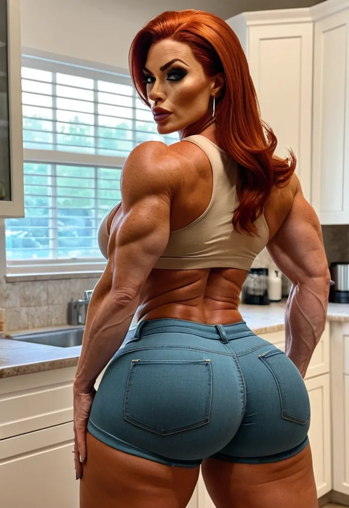 Caucasian Generate Gorgeous female boss , bimbo , hourglass body , female bodybuilder , gorgeous , close up , full lips , big booty , redheaded , freckles on face and breast , pompadour design hair , feminine silhouette , too big breast , big booty , sexy thighs abs , silhouette , up close , flexing biceps , beautiful green eyes , legs are iconic and defining physical feature , both visually and in terms of combat ability.wearing an outfit that is a striking blend of elegance , power , and femininity , designed to command attention in any room. The suit is tailored to perfection , hugging the wearer’s curves with precision while emphasizing a structured silhouette. The fabric itself is a refined grey tweed patterned with subtle white grid lines , giving the suit a texture that feels both sophisticated and modern. The blazer features broad blue lapels and gold button accents , adding a luxurious touch that elevates the look beyond typical business attire. The matching high-waisted trousers elongate the frame , further enhancing the poised and commanding effect of the ensemble.The styling choices amplify the boldness of the suit. The inner blouse is a silky , greybutton-down shirt that complements the tweed’s tone while introducing a softer , feminine balance to the sharp tailoring of the jacket. The blouse peeks out neatly from under the blazer , maintaining elegance without drawing focus away from the suit’s commanding cut. Accessories are kept minimal yet intentional: a delicate layered gold necklace and hoop earrings that add glimmers of light and luxury without overpowering the outfit. The choice of voluminous , honey-brown braids cascading down her shoulders frames the face with both confidence and glamour , completing the commanding visual.Altogether , this look communicates a blend of authority and allure. It is business-ready yet fashion-forward , balancing corporate structure with vibrant femininity. The color palette blue , grey and gold avoids being overly delicate , instead embracing the richness of texture , structure , and presence. This is the kind of ensemble that speaks to ambition , sophistication , and personal style—ideal for someone who thrives in positions of influence but insists on expressing her individuality with bold elegance. It’s not just clothing—it’s a statement of power wrapped in grace. In luxury living legs that could crush a watermelon , skirt and computer lab standing over computer close up , full lips , big booty , redheaded , freckles on face and breast , hair , feminine silhouette , too big breast , big booty , sexy thighs abs , silhouette , up close , flexing biceps , beautiful green eyes , beige tank top , blue jean shorts , standing in kitchen , stacked hourglass silhouette ,