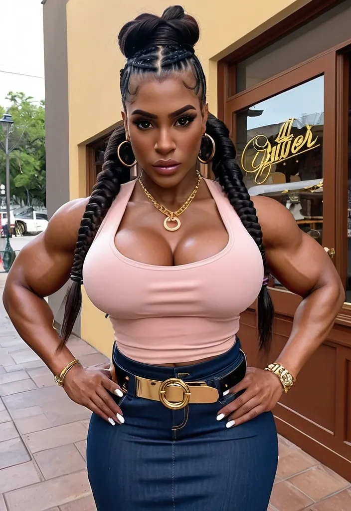 Generate Adrienne-Joi Johnson face , African-American dark-skinned woman , pony face prominent jawline Gorgeous female boss , abnormally massive female bodybuilder , gorgeous , Close up , full lips , big booty , hair stylish design braided mohawk , hair , feminine silhouette , thong , .massive cleavage , too big breast , beautiful brown eyes , brown big booty , curvy hips , toned legs , Wearing a stylish and cohesive look with a soft pink top that complements a high-waisted , dark navy skirt with a prominent gold belt buckle , adding a touch of elegance. The ensemble is accessorized with large pink hoop earrings , a gold necklace with a “Mother” pendant , multiple gold bangles , and a matching pink handbag , creating a vibrant and coordinated appearance. The long , braided hair in a warm brown tone enhances the overall aesthetic , while the setting outside a café suggests a casual yet fashionable outing. This combination of colors and accessories reflects a bold yet harmonious fashion choice , standing in living room , enormous breast , enormous butt , massive cleavage , too big breast , big butt , stacked hourglass silhouette , powerful feminine silhouette , massive breast , too big breast , pushed up breast , denim pants ,