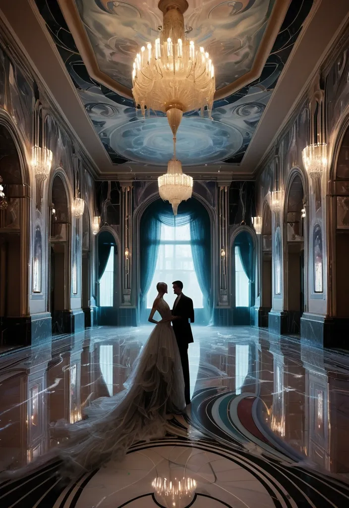 An opulent , art deco ballroom , filled with spectral figures engaged in a ghostly waltz. Ornate chandeliers drip with ethereal light , casting shimmering patterns on the polished marble floor. The air is thick with a sense of forgotten grandeur and elegant melancholy. The style is a fusion of surrealism and abstract expressionism , with bold , fluid lines and a rich , jewel-toned color palette , creating a dreamlike and captivating visual. Influenced by the works of Tamara de Lempicka and Wassily Kandinsky. ,