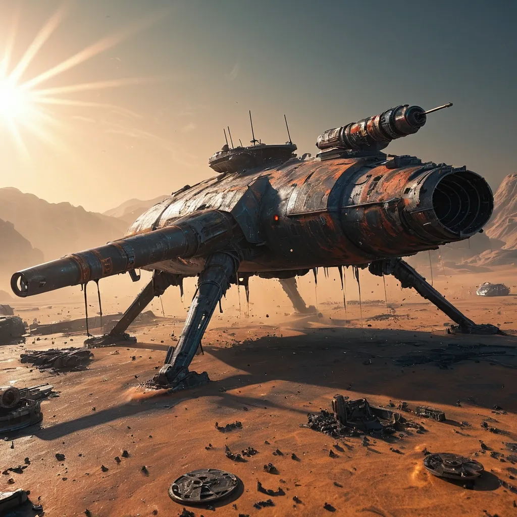 A massive , futuristic battleship uniquely crab shaped , detailed tinted glass windows with pilot , fluorescent Orange-Black shell , hovers above a war-torn planet , its hull covered in glowing red and blue markings. The ship’s weapons are charged and ready , emitting a faint hum. Below , the planet’s surface is scarred by craters and glowing fissures. [Realistic Battlefield - Physical Texture] The fuselage surface is covered with realistic mission wear marks , and fine hydraulic oil seeps from the main rotor hubs , forming an iridescent film on the metal surface. Traces of insect remains from the previous night's flight remain on the windshield , and the sides of the landing gear tires bear realistic dirt and wear marks. Each rivet bears subtle traces of rust , and genuine sealant seeps out at the seams of the skin. [Color Inferno · Physical Spectrum] The ship’s presents a cold , armored gray , with irregular variations in shade due to oil and wear. The grayish-brown dust billowing from the ground displays a realistic interplay of warm and cool tones in the morning light , with nearby sand grains exhibiting a translucent , backlit texture. The rotor blades , operating at maximum speed , produce a realistic thermal halo effect , and light is physically refracted and distorted as it passes through the rapidly spinning blades. [Battlefield Collapse · Realistic Destruction] Distant mountains rise in realistic dust walls from the shockwave , and the torn texture of the canvas fibers is clearly visible when tents are ripped apart. Apart from the colossal metal beast dominating the sky , everything in the scene collapses under the true laws of physics; every grain of dust , every scratch on the metal , tells the story of the real arrival of this steel storm. ,