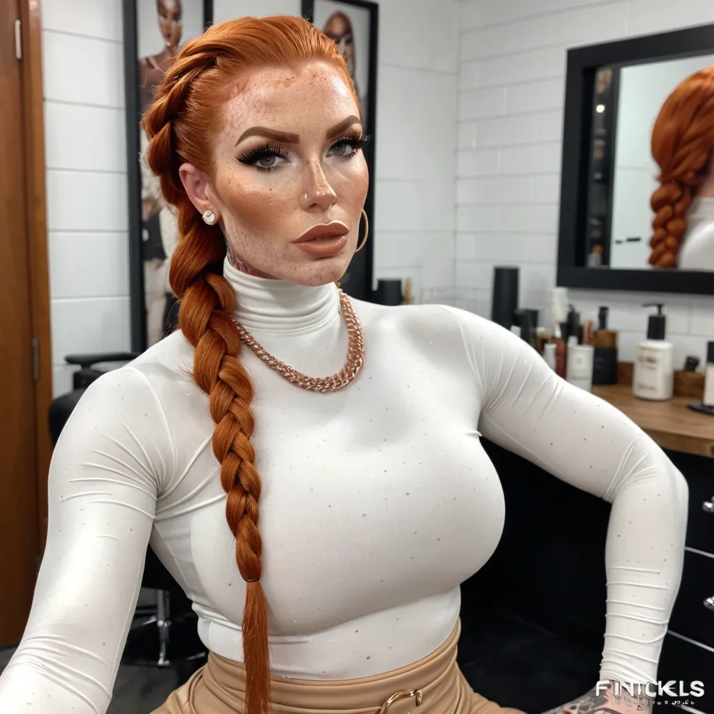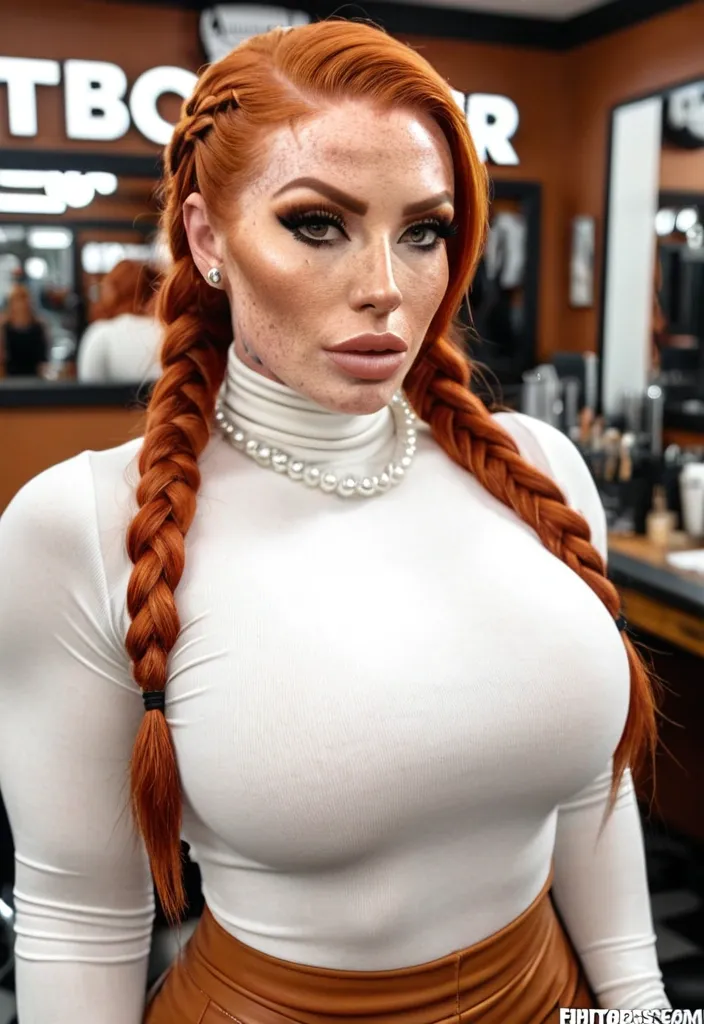 Generate Gorgeous female boss , bimbo , hourglass body , abnormally massive female bodybuilder , gorgeous , close up , full lips , big booty , redheaded , freckles on face and breast , braided design hair , feminine silhouette , too big breast , big booty , sexy thighs abs , silhouette , up close , flexing biceps , beautiful green eyes , legs are iconic and defining physical feature , both visually and in terms of combat ability.wearing an outfit that is a striking blend of elegance , power , and femininity , designed to command attention in any room. The suit is tailored to perfection , hugging the wearer’s curves with precision while emphasizing a structured silhouette. The fabric itself is a refined grey tweed patterned with subtle white grid lines , giving the suit a texture that feels both sophisticated and modern. The blazer features broad blue lapels and gold button accents , adding a luxurious touch that elevates the look beyond typical business attire. The matching high-waisted trousers elongate the frame , further enhancing the poised and commanding effect of the ensemble.The styling choices amplify the boldness of the suit. The inner blouse is a silky , greybutton-down shirt that complements the tweed’s tone while introducing a softer , feminine balance to the sharp tailoring of the jacket. The blouse peeks out neatly from under the blazer , maintaining elegance without drawing focus away from the suit’s commanding cut. Accessories are kept minimal yet intentional: a delicate layered gold necklace and hoop earrings that add glimmers of light and luxury without overpowering the outfit. The choice of voluminous , honey-brown braids cascading down her shoulders frames the face with both confidence and glamour , completing the commanding visual.Altogether , this look communicates a blend of authority and allure. It is business-ready yet fashion-forward , balancing corporate structure with vibrant femininity. The color palette blue , grey and gold avoids being overly delicate , instead embracing the richness of texture , structure , and presence. This is the kind of ensemble that speaks to ambition , sophistication , and personal style—ideal for someone who thrives in positions of influence but insists on expressing her individuality with bold elegance. It’s not just clothing—it’s a statement of power wrapped in grace. In luxury living legs that could crush a watermelon , skirt high boots are a bold and striking statement piece , crafted in glossy black patent leather that gives them a sleek , polished finish. Rising to just below the knee , the boots feature three adjustable buckle straps along the shaft , adding both edge and detail to their design. The towering stiletto heel , paired with a thick platform sole , creates an ultra-dramatic silhouette that elongates the leg and exudes power and confidence. With their combination of shine , height , and structure , these boots perfectly balance fierce femininity with high-fashion allure , pearl white turtleneck sleeves tank top. , and leather beige skirt , diamond sapphire necklace in barbershop , freckles , ginger hair ,