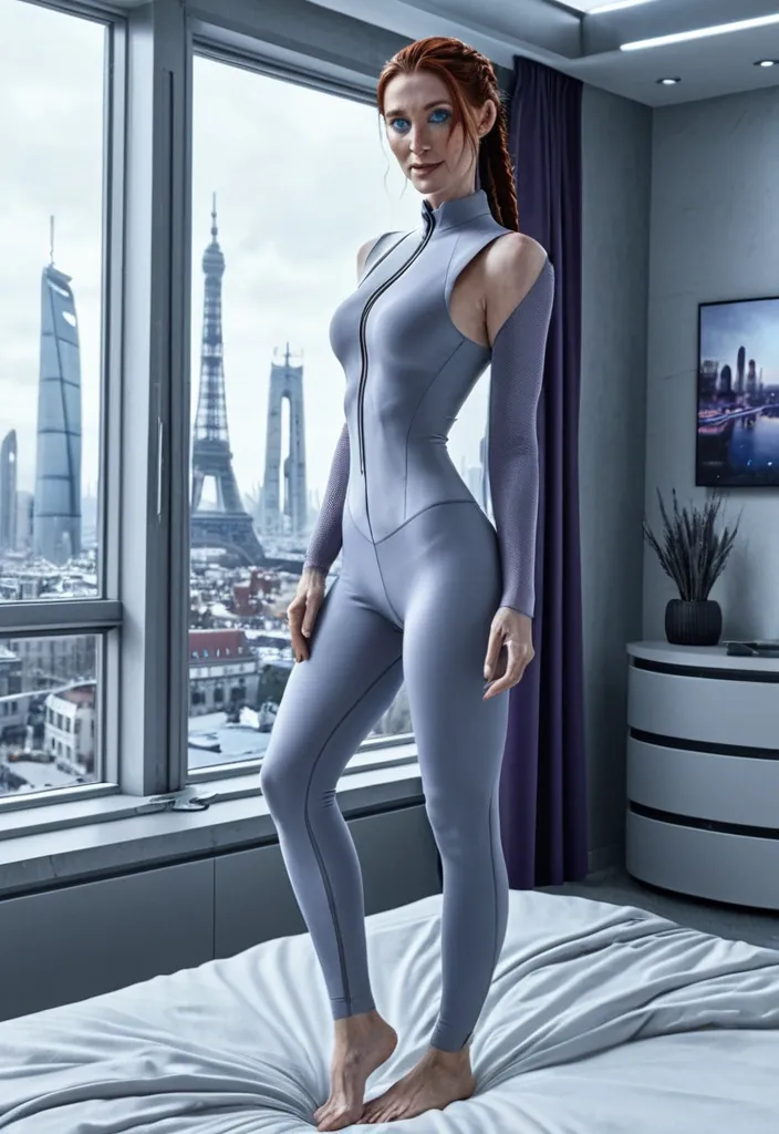 Masterpiece photo realistic full lenght , grey-purple spandex sleeveless spandex open zipper sweater top and grey legging , one long dark-auburn braid hair white pale freckled 21yo european young woman , pale blue eyes , flat breats innocent shy smile , barefoot , in a clean futuristic city bedroom , we can see a futuristic lanscape through a window , she's standing up lovely her right hand on her hip next a bed with blue pillows and a little blue teddy bear on. it's the night. Cinematic style ,