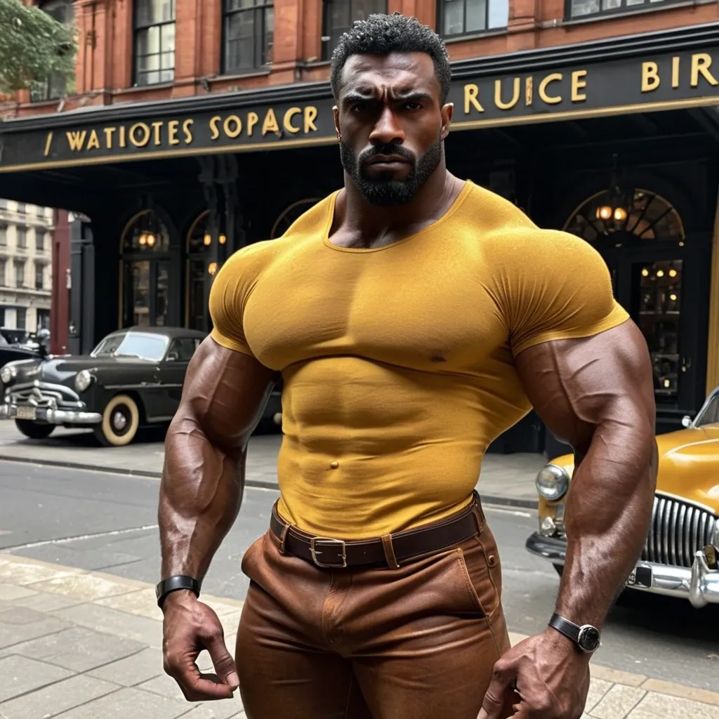 Generate ruggedly handsome dark-skinned African-American man abnormally massive male bodybuilder , 1940s coarse hair , a park down the middle of hair , close up , full lips , big booty , black trimmed coarse hair , big , muscular man , brown strikingly intense and alluring eyes , up close , flexing biceps , beautiful brown eyes , legs are iconic and defining physical feature , both visually and in terms of combat ability.wearing an outfit that is a striking blend of elegance , power , and femininity , designed to command attention in any room. The suit is tailored to perfection , hugging the wearer’s curves with precision while emphasizing a structured silhouette. The fabric itself is a refined grey tweed patterned with subtle white grid lines , giving the suit a texture that feels both sophisticated and modern. The blazer features broad blue lapels and gold button accents , adding a luxurious touch that elevates the look beyond typical business attire. The matching high-waisted trousers elongate the frame , further enhancing the poised and commanding effect of the ensemble.The styling choices amplify the boldness of the suit. The inner shirt is a silky , greybutton-down shirt that complements the tweed’s tone while introducing a masculine balance to the sharp tailoring of the jacket. The shirt peeks out neatly from under the blazer , maintaining elegance without drawing focus away from the suit’s commanding cut. Accessories are kept minimal yet intentional: a delicate layered gold necklace ad alpha leader of light and luxury without overpowering the outfit completing the commanding visual.Altogether , this look communicates a blend of authority and allure. It is business-ready yet fashion-forward , balancing corporate structure with vibrant femininity. The color palette blue , grey and gold avoids being overly delicate , instead embracing the richness of texture , structure , and presence. This is the kind of ensemble that speaks to ambition , sophistication , and personal style—ideal for someone who thrives in positions of influence but insists on expressing her individuality with bold elegance. It’s not just clothing—it’s a statement of power wrapped in grace. In luxury living legs that could crush a watermelon , skirt high boots are a bold and striking statement piece , crafted in glossy black patent leather that gives them a sleek , polished finish. Rising to just below the knee , the boots feature three adjustable buckle straps along the shaft , adding both edge and detail to their design. The towering stiletto heel , paired with a thick platform sole , creates an ultra-dramatic silhouette that elongates the leg and exudes power and confidence. With their combination of shine , height , and structure , these boots perfectly balance fierce femininity with high-fashion allure , wearinfg a yellow T-shirt with brown suspenders and brown denim pants standing in a beautiful gorgeous art deco bar ,