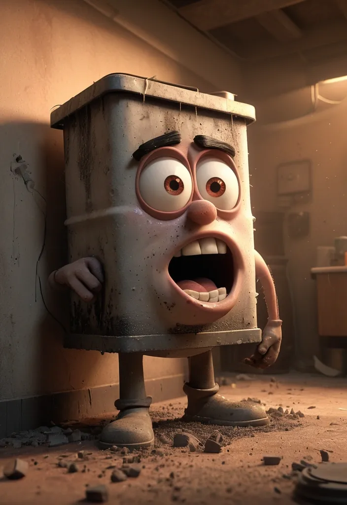 Pixar-style 3D render of a filthy HVAC furnace filter pulled halfway out of a unit. Eyes: bloodshot and tired , barely visible through layers of dust Eyebrows: clumped and sagging with grime Mouth: wheezing grimace , clogged with dirt Arms: trembling , struggling to hold itself together as dust falls off Scene: dim basement utility room , furnace light flickering behind , thick dust motes floating in dramatic Pixar-style lighting ,