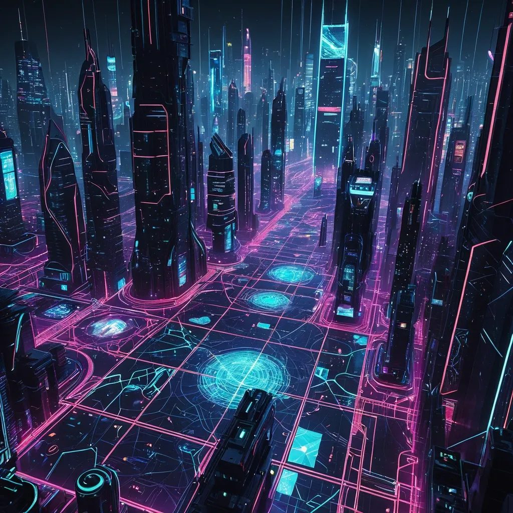 A breathtaking cyberpunk cityscape at night , illuminated by neon lights and glowing holographic billboards. The city is a sprawling metropolis filled with towering skyscrapers , their surfaces adorned with intricate digital circuits and floating data streams. Holographic projections of various shapes and sizes float in the air , displaying advertisements , news feeds , and abstract art. The streets below are bustling with activity , yet everything is bathed in the eerie glow of the neon lights , creating a dark yet vibrant atmosphere. High-tech devices like AR glasses and virtual control panels are scattered throughout the scene , adding to the futuristic feel. The entire city is connected by a vast network of glowing grids and pathways , symbolizing the interconnectedness of this digital world. ,