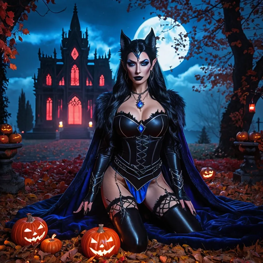 A breathtaking character with tattoos and makeup augmenting portrait set against a dramatic twilight sky , with vibrant hues of blue and deep purple , illuminated by a glowing sunset. A beauty woman as a batwoman depicted in a sleek , form-fitting black cat cosplay costume with fur and laces , a miniskirt with chains and elven decorated (style:1.2) , enriched by a white fur trim and a striking blue gem pendant. Her long , flowing hair cascades down , capturing the wind's movement , with strands glowing softly in the low light , she lie son a fluffy beautiful blanket near ba a black cat and a halloween pumpkin with candle , other candlelight around , The focus should be on the elegant pose and the intricate details in the costume and accessories. The background is a elven temple , includes halloween decorations and moonlight beams , die colorsare deep blue and bright red , fog and roses Include autumn leaves , . The composition emphasizes the character in the foreground , balancing negative space to enhance the visual impact of the subject. The lighting should appear natural yet slightly enhanced , emphasizing depth and dimension , with shadows adding drama (lighting:1.2). Use an anime-inspired style for an engaging visual effect , with influences from renowned artists in this genre. Ideal for a digital illustration , excluding realism. Prompts by Follwerine ,