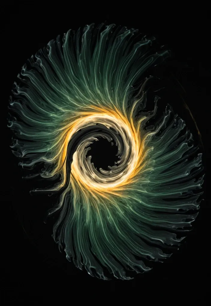 A aerial shot from very high altitude. A Eagle in form of drone view , silhouette emerges from a mass of swirling , black hole against a completely black background. The Eagle is composed entirely of soft , fluid streaks that blend into one another: luminous golden and pale gray at the head and shoulders , shifting into bright green , white , golden and orange as the form descends. The shapes twist and ripple as though made of painted smoke or liquid light , giving the impression of constant , silent movement. The head tilts gently downward , defined only by subtle curves and shadows formed by the color transitions. ,